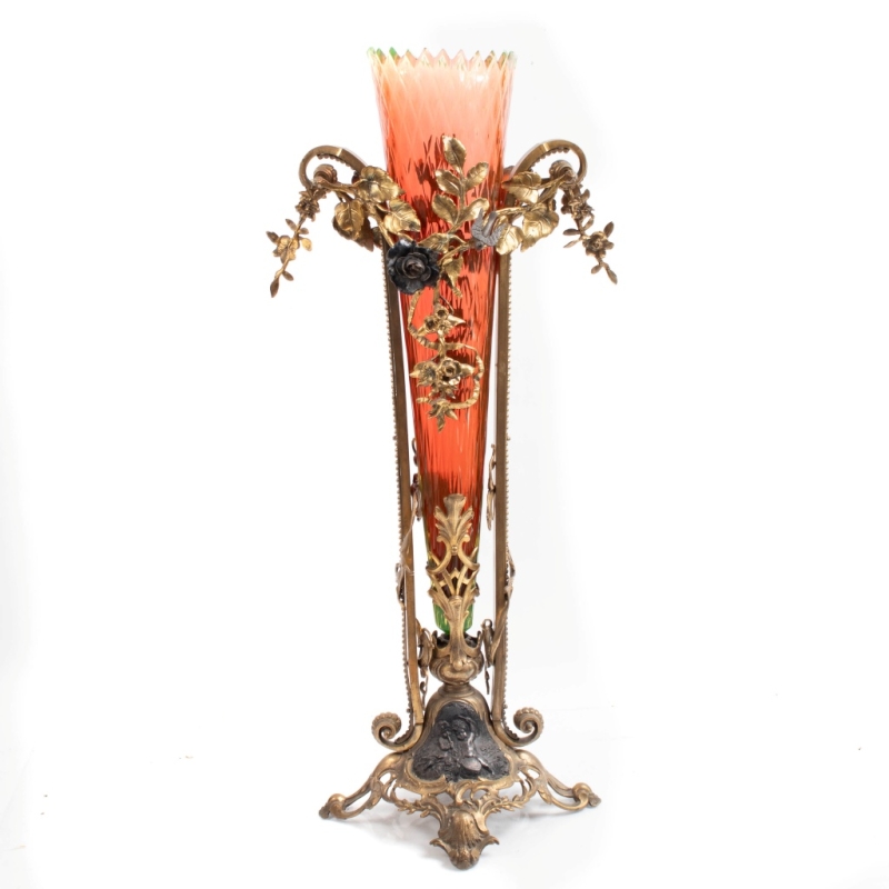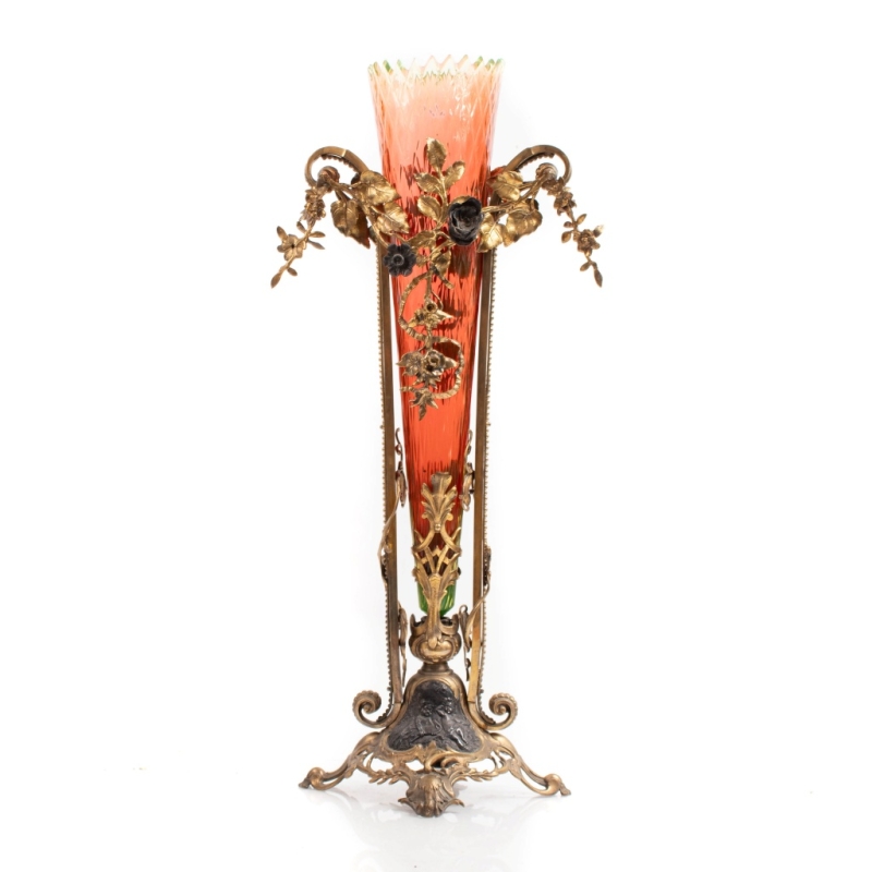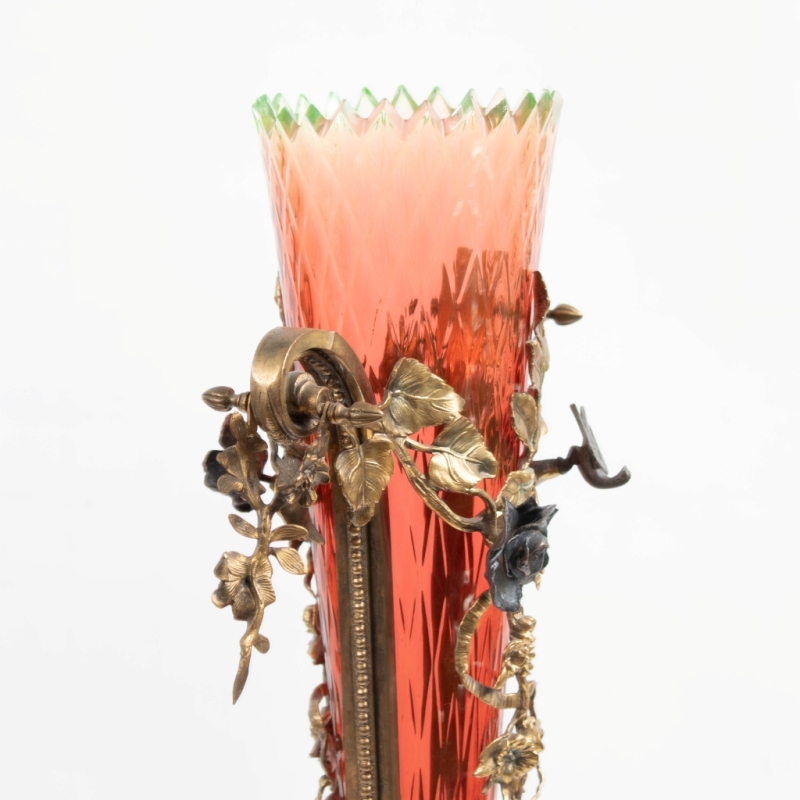 in red-lined Ouraline crystal, with a bronze mount in black and gold patina, richly decorated with flowering branches and a base featuring putti motifs