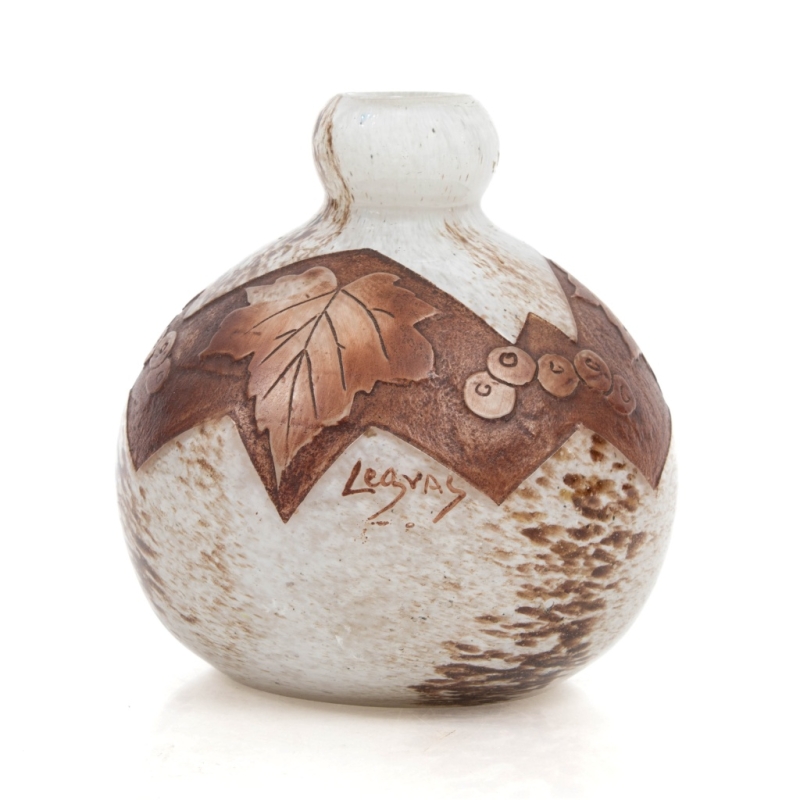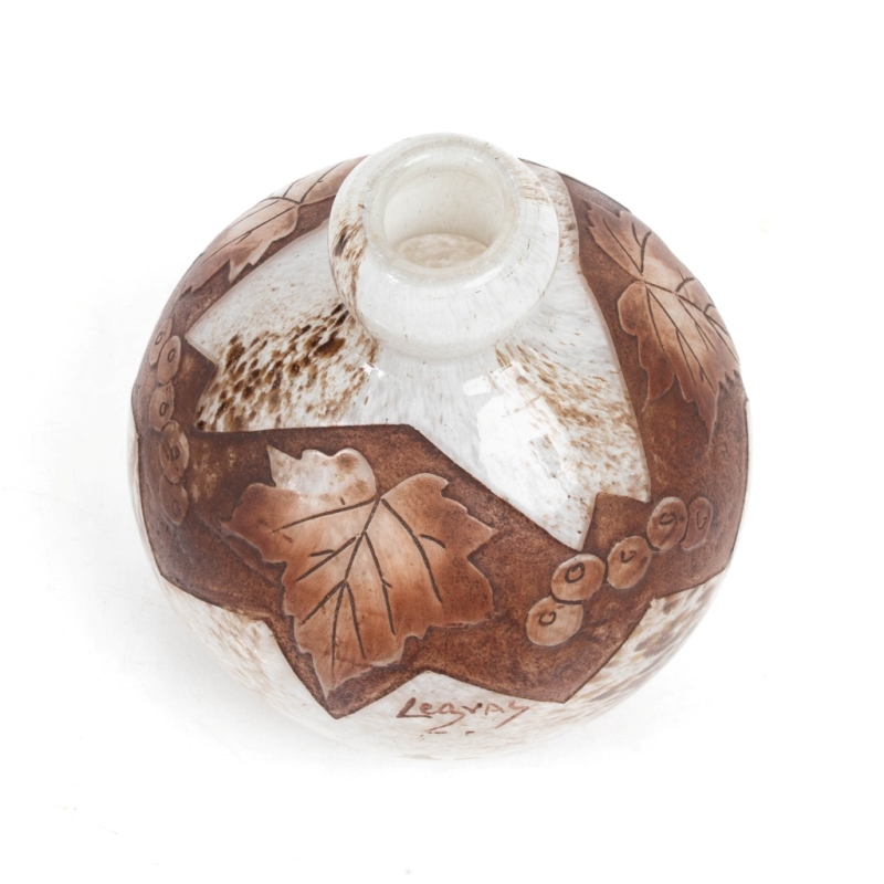 made of double-layered glass with acid-etched and brown-enamelled decoration on a white ground marbled with brown, signed