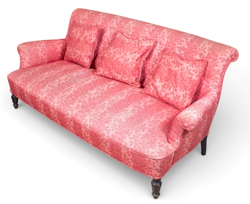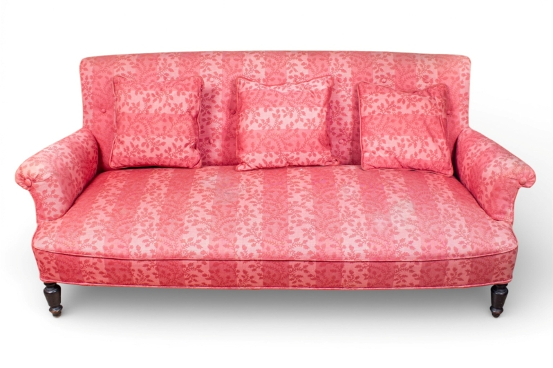 fully upholstered in striped and floral fabric in shades of pink, with a black lacquered wooden base