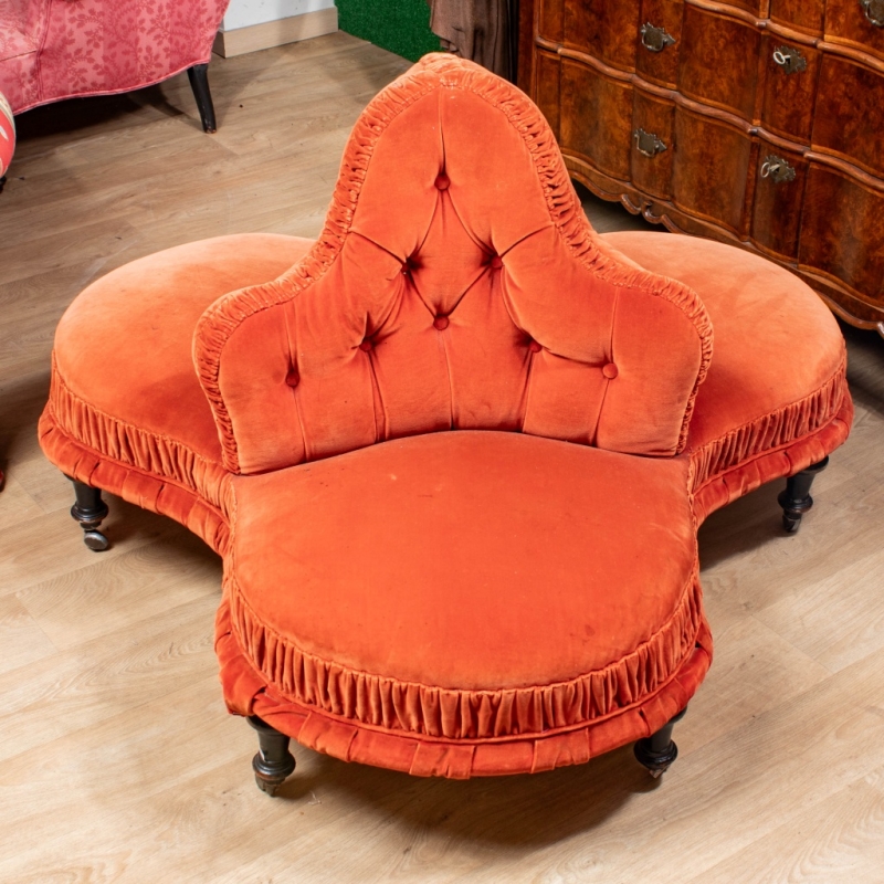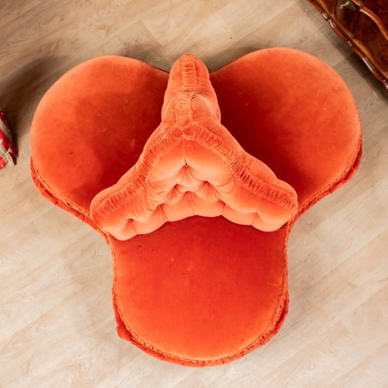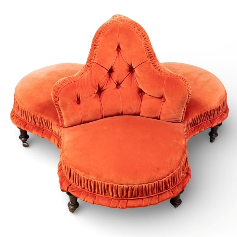 in red tufted velvet on a black lacquered wooden base