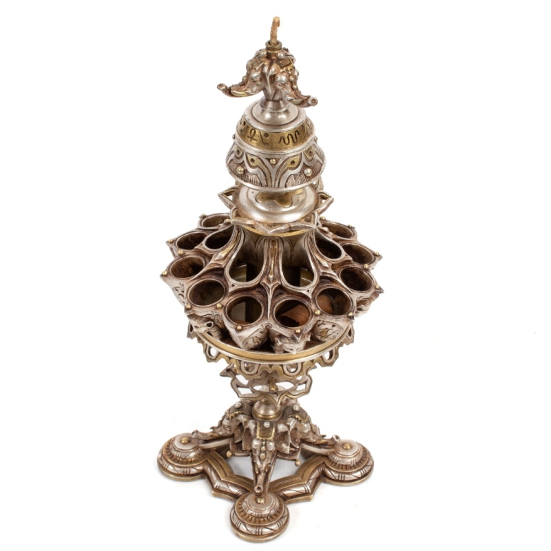 in bronze with silver and gold patinas, decorated with Egyptian motifs, featuring a cigar holder (12 slots), a removable ashtray and a cigar lighter at the top