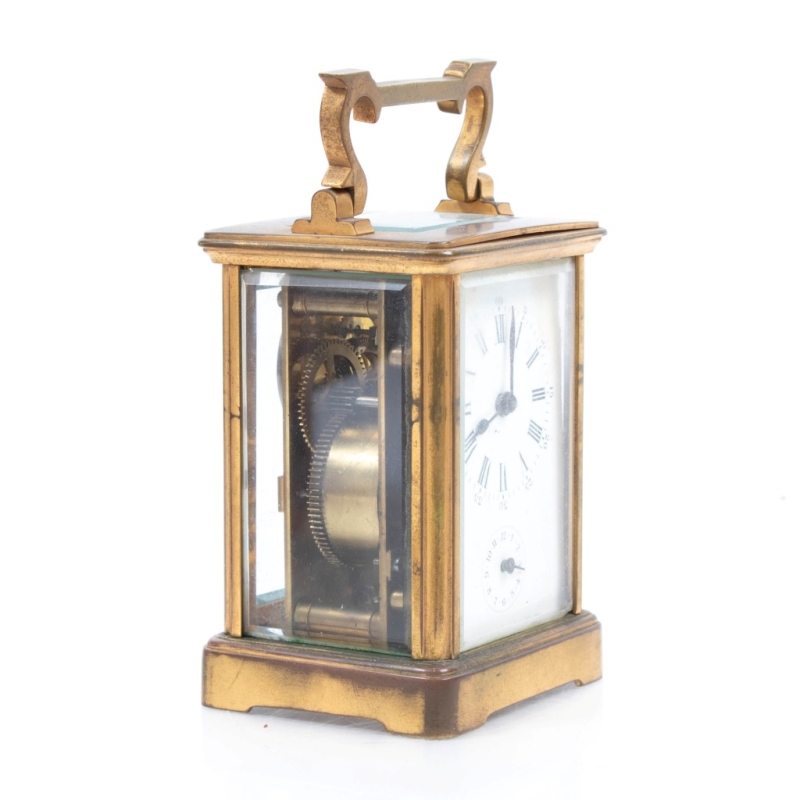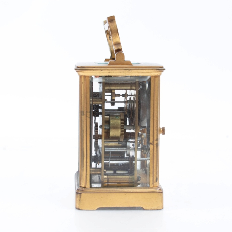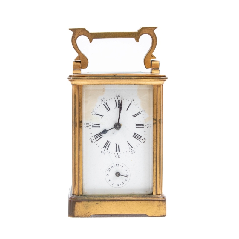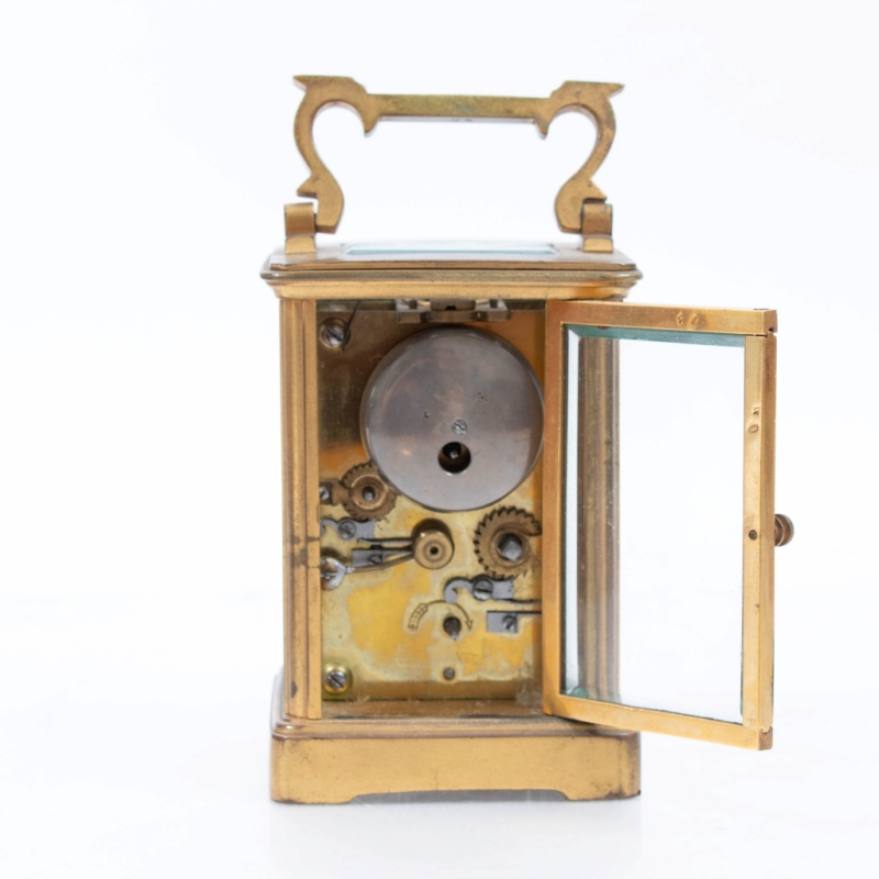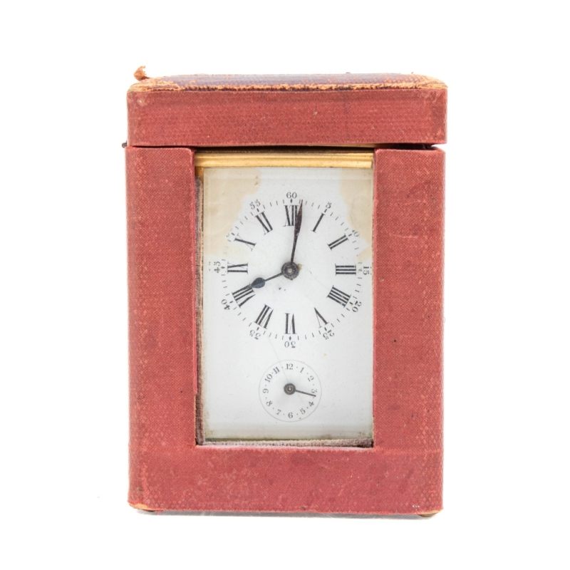 in brass, with a white enamelled dial featuring Roman numerals for the hours and Arabic numerals for the minutes, in its original box
