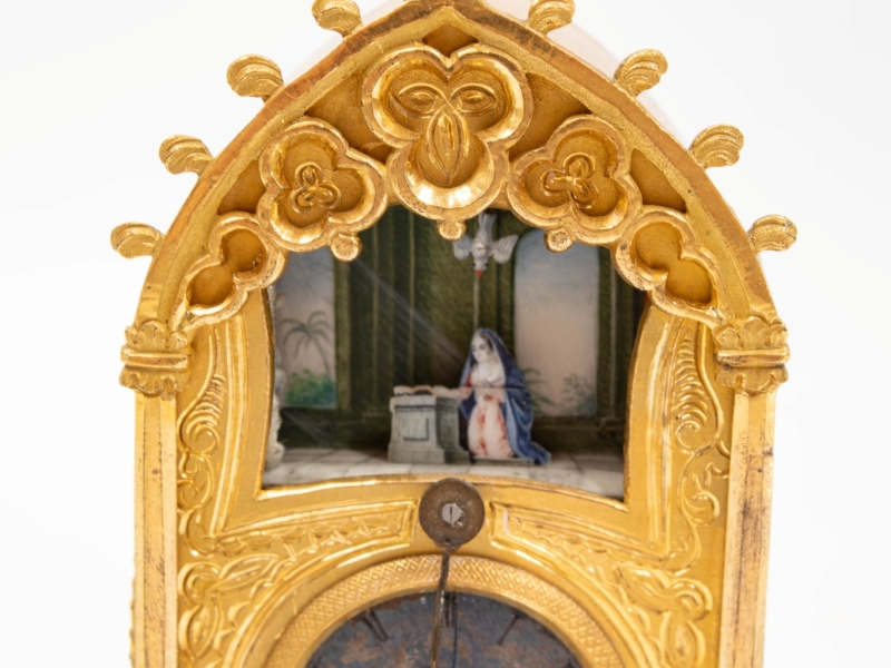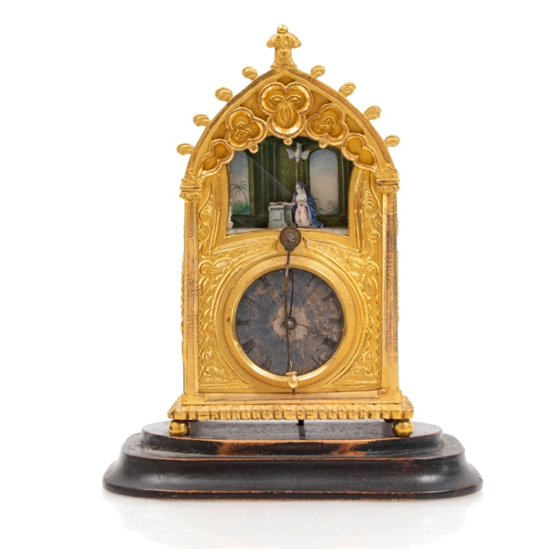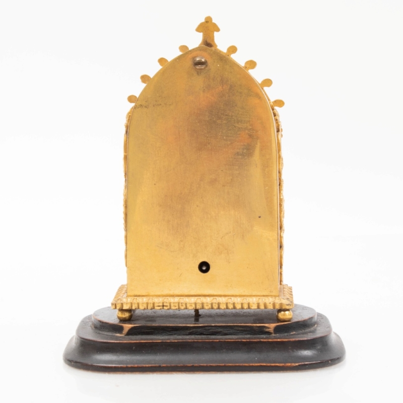 in gilded bronze, ‘cathedral’ style, decorated with a niche depicting the Annunciation, silver-plated metal dial with Roman numerals, blackened wooden base. With keys