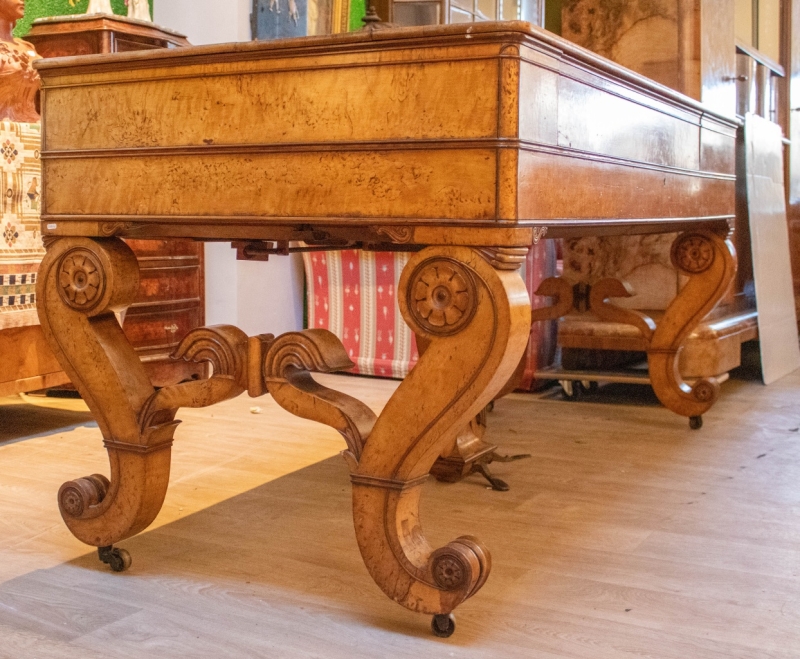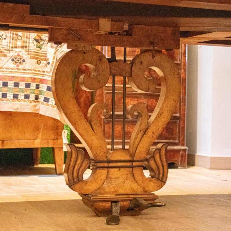 in elm burl veneer, lyre-shaped pedal support. Signed Pape Paris, plaque reading ‘1st gold medal awarded by the jury 1834’, original explanatory label.