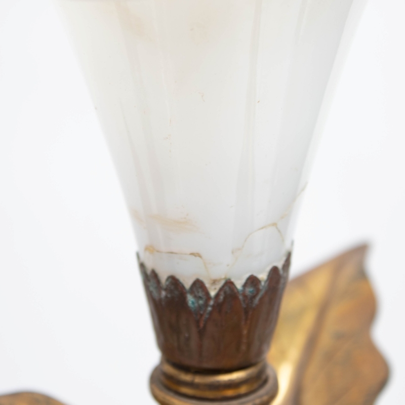in bronze with a brown and gold patina, opaline glass tulip.