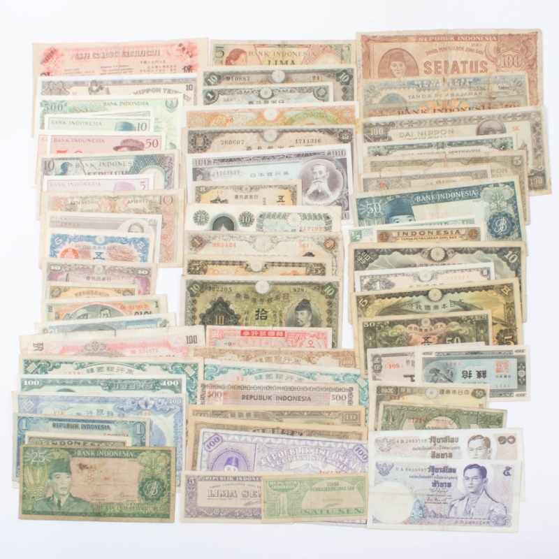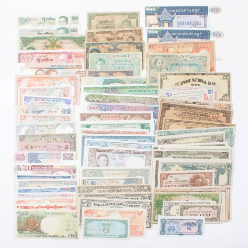 Cambodge, 1000 Riels, 1972 ; 500 Riels, 1968 ; 100 Riels, 1972, 1973 ; Ceylon, 2 Rupees, 26.3.1979 ; Corée du Sud, 1000 Won, (1952) ; 100 Hwan, (1954) ; 10 Hwan, (1953) ; 10 Won, (1953) ; 5 Won, (1953) ; Indonésie, 100 Rupiah, 1958 ; 50 Rupiah (2), 1.1.1959, 1960 ; 25 Rupiah, 1960 ; 10 Rupiah, 1952 ; 1/2 Rupiah, 17.10.1945 ; 25 Sen, 1947 ; 10 Sen, 1947 ; émission du gouvernement du Japon dont 10 Roepiah, (1944) ; émission de 1964: 25 Rupiah, 50, 25, 10, 5, 1 Sen ; Pematang Siantar, 100 Rupiah, 31.3.1947 ; Total revolutionary charter, 500 Rupiah, 1959 ; Japon, 100 Yen, (1953-74) ; 10 Yen (2), (1930), (1946) ; 10 Sen (1917-21) ; 5 Sen (1944) ; Singapour, 2 Dollars, (1992) ; Thaïlande, 20 Baht, (1953) ; Baht (2), sign.17 with 3 european numerals, 1946 sign.22 ; avec des émissions de Laos, Malaysie, Philippines, Vietnam, et des émissions du Japanese Government pour Birmanie, Philippines et Malaysie, etc.