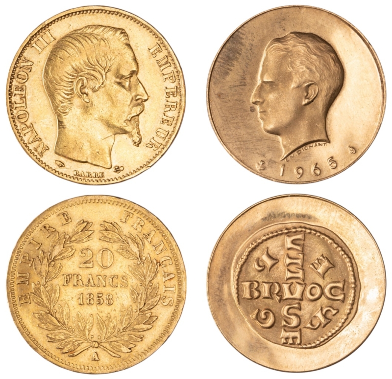 Médaille en or 900/1000, commémorant les 1000 ans du monnayage de Bruxelles, 10,05g, 1965 (LA#BHM5.2 ; Morin M/14). Superbe ; France, 20 Francs, 1858 A, 6,44g (F.531.13 ; Gad.1061).