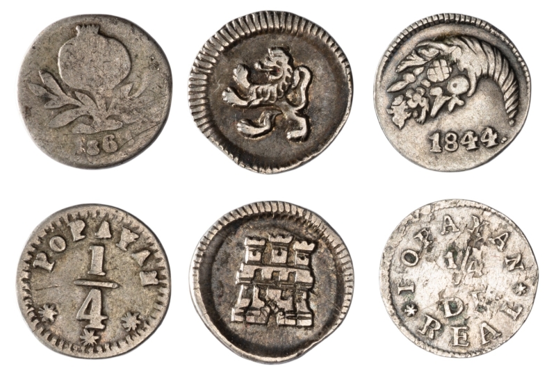 1/4 Real, 1844/3, 0,54g, frappe monnaie (KM.90.2). Rare, griffes, nettoyé, très beau ; 1/4 Real, 1861, 0,72g, frappe monnaie (date non-répertoriée dans le World Coins cf KM108.2). Griffes, assez beau ; avec 1/4 Real, Ferdinand VI ou Charles III, n.d., 0,80g, pas de marque d'atelier, frappe médaille (KM.A30).