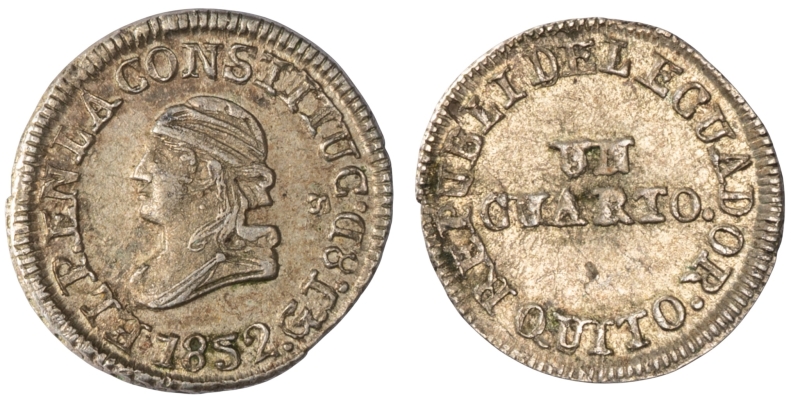 1/4 Real, 0,75g, 1852 GJ, Quito, frappe monnaie (KM.36).