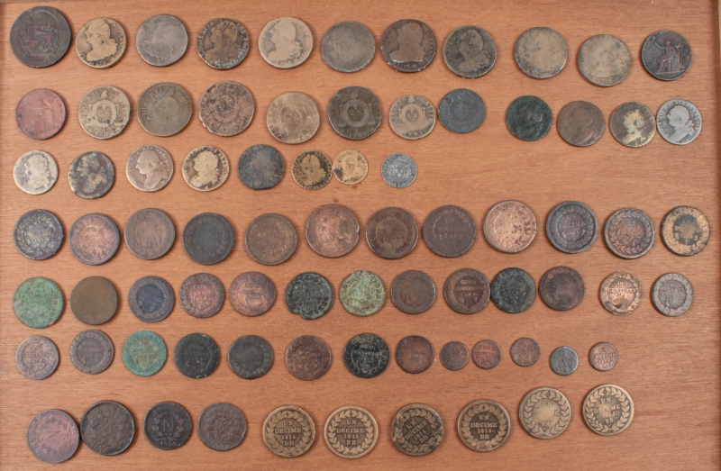 Dixième d'écu 1778 A ; 5 Sols aux serment Monneron, 1792 ; 2 Sols à la liberté Monneron (2), 1791, 1792 ; 2 Sols, date illisible (2), 1792 A, 1792 AA (2), 1792 W (2), 1793 BB, 1793 W ; 2 Sols aux balances, 1793 AA, 1793 BB (2) , 1793 I (2) ; Sol aux balances, 1793 (atelier illisible) (2) ; 12 Deniers, date illisible (3), 1791 A, 1791 B, 1792 B (?), 1792 MA, 1792 T, 1792 W ; 6 Deniers, 1792 I ; 3 Deniers, date illisible ; 2 Décimes, AN4 A ; Décime, date illisible (8), AN4 A (UN en creux), AN 5 A, AN5 BB, AN5 D, AN7 BB ; 5 Centimes, date illisible (2), AN4 I (?), AN5 (atelier illisible), AN5 A, AN5 BB, AN5 D, AN5 R, AN8 A (4), AN8 AA, AN8 BB (2), AN8 G (2), AN 8 W, AN9 G ; Centime, date illisible (3), AN7 A, AN8 A ; Siège d'Anvers, 10 Centimes (2), 1814 W Napoléon, 1814 R Louis XVIII ; 5 Centimes (2), 1814 Napoléon, 1814 Louis XVIII ; Siège de Strasbourg, Décime Napoléon (3), 1814 BB point après décime et date (2), 1815 BB point après décime et date ; Décime Louis XVIIII (3), 1814 BB point après décime et date, 1815 BB sans point, 1815 BB point après décime et date.