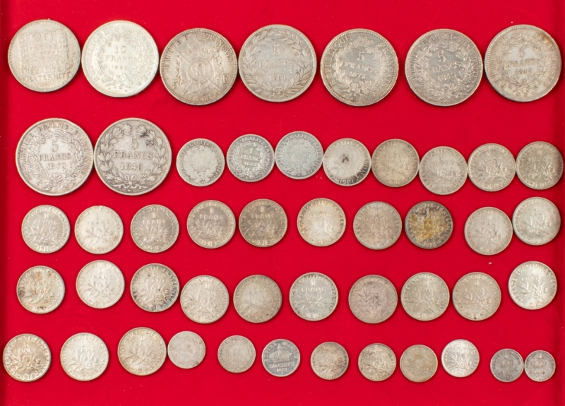 20 Francs, 1938 ; 10 Francs, 1965 ; 5 Francs (7), 1831 W tranche en creux, 1848 A Louis-Philippe, 1849 A Cérès, 1849 BB Hercule, 1868 BB, 1870 A, 1873 A ; Franc (31), 1871 K, 1872 A, 1888 A, 1901, 1909, 1910 (2), 1911 (3), 1912 (3), 1913 (8), 1915 (2), 1917 (2), 1919 (6) ; 50 Centimes (7), 1867 A, 1881 A, 1882 A, 1899, 1917 (2), 1918 ; 20 Centimes (2), 1866 A, 1867 A.