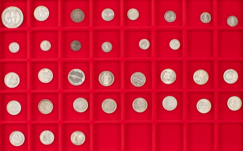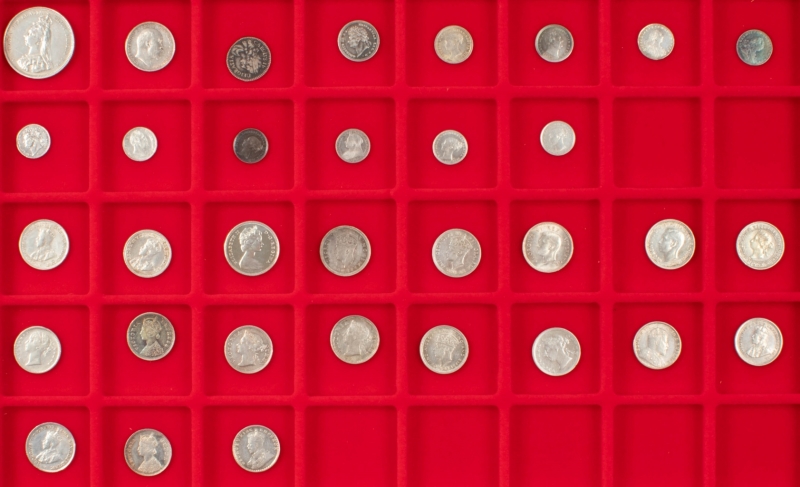 Shilling, 1887 jubilee ; Threepence, 1905 ; Twopence (2), 1676, 1829 ; Three-Halfpence (2), 1834, 1862 ; Penny, 1800 (2), 1825, 1840, 1869, 1880, 1897 ; avec Australie, Threepence (2), 1926, 1942 ; British West Africa, Threepence, 1919 H ; Canada, 10 Cents, 1967 ; 5 Cents, 1913 ; Newfoundland, 5 Cents, 1940 ; Ceylon, 10 Cents, 1893 ; Hong Kong, 5 Cents (2), 1889, 1901 ; Inde, Two Annas (4), 1841, 1862, 1900, 1916 ; Malaya, 5 Cents, 1945 ; South Africa, Threepence, 1943 ; Southern Rhodesia, Threepence, 1940 ; Straits Settlements, 5 Cents (3), 1898, 1910, 1926.