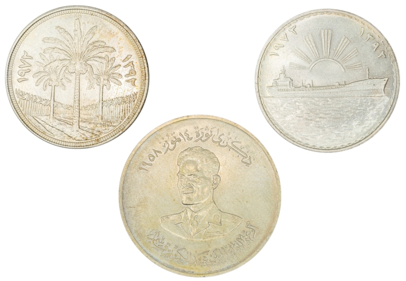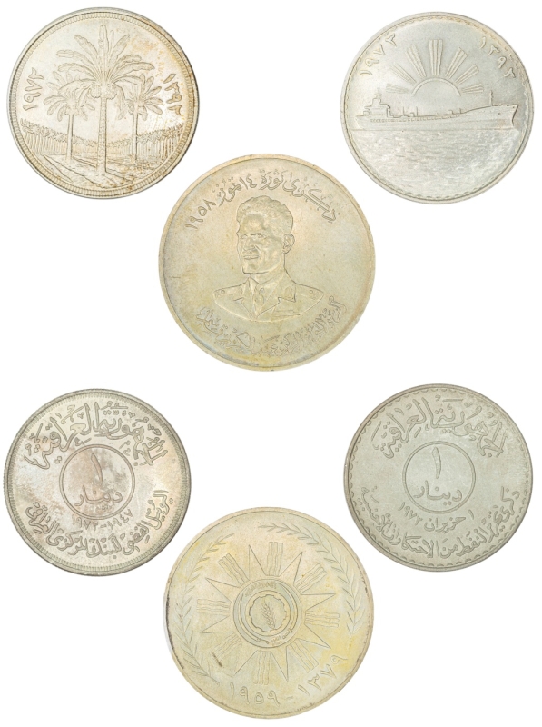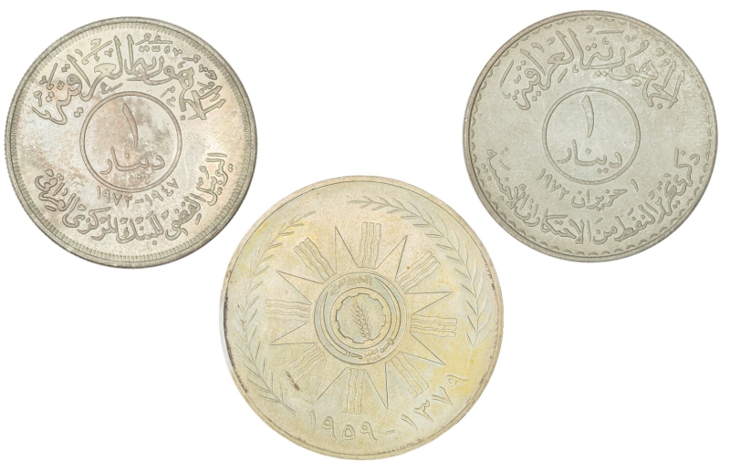 Dinar (2), 1972, 1973 (KM.139, 140). Hairlines, patinés, superbe ; 500 Fils, 37,89g, 1959/AH1379, anniversaire de la révolution du 14 juillet, buste de Abdul Karim Kassem (KM.X.1).