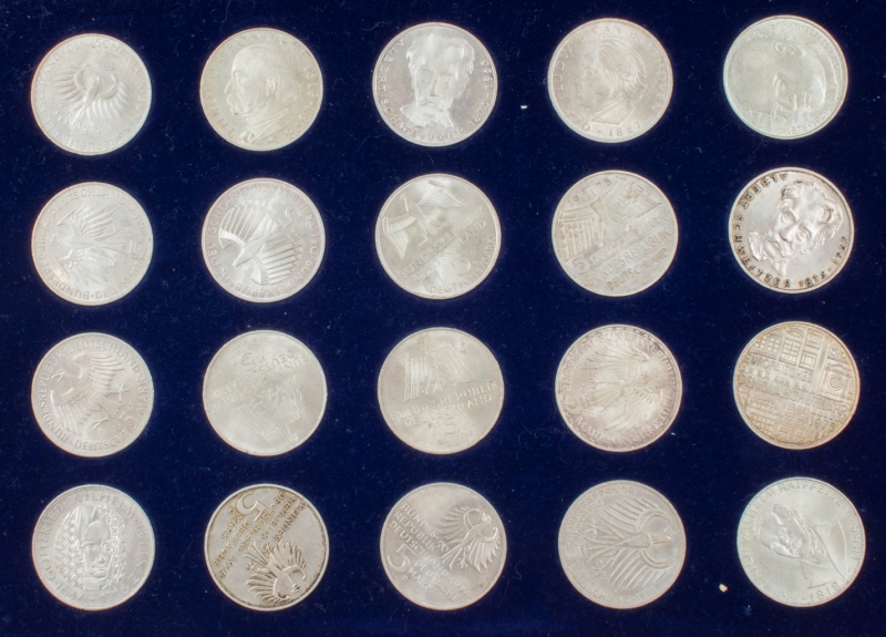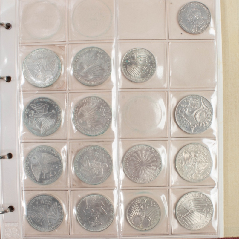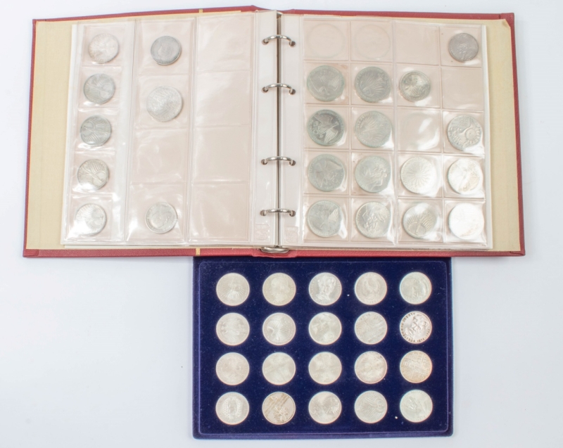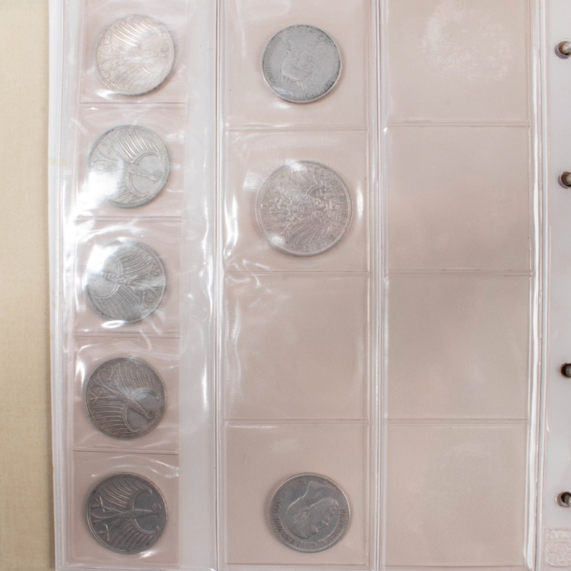 Un album comprenant Allemagne, 2 Reichsmark, 1937 A ; 10 Mark (4), 1972 D (3), 1972 F (3), 1972 G (3), 1972 J (2), 1987 J ; 5 Mark (7), 1958 D, 1958 F, 1958 G, 1960 G, 1966 G, 1972 J, 1973 G ; 1/2 Mark, 1907 A ; 50 Pfennig, 1876 A ; Baden, 2 Mark, 1876 G ; Bavière, 3 Mark, 1912 D ; Hambourg, 5 Mark, 1904 J ; Prusse, 3 Mark, 1912 A ; 2 Mark, 1901 A 200th anniversaire de la Prusse (2) ; Saxe, Thaler, 1860 B (coups importants) ; 5 Mark, 1876 E ; On y joint un écrin comprenant 20 x 5 Deutsche Mark en argent 625 datant de 1966 à 1978 ; Australie, Florin, 1910 ; Autriche, 25 Schilling, 1956 ; Grande-Bretagne, Florin, 1929 ; Shilling, 1926 ; Sixpence, 1916 ; Russie, 50 Kopek, 1924 ; avec Vatican, Médaille en bronze coulée, Jules II, rev. RECVPERATOR IVSTITIAE PACIS FIDEIQ, 45mm ; Calixte III, Médaille en bronze coulée, Voeu du pape de reprendre Constantinople aux Turcs, 40mm.