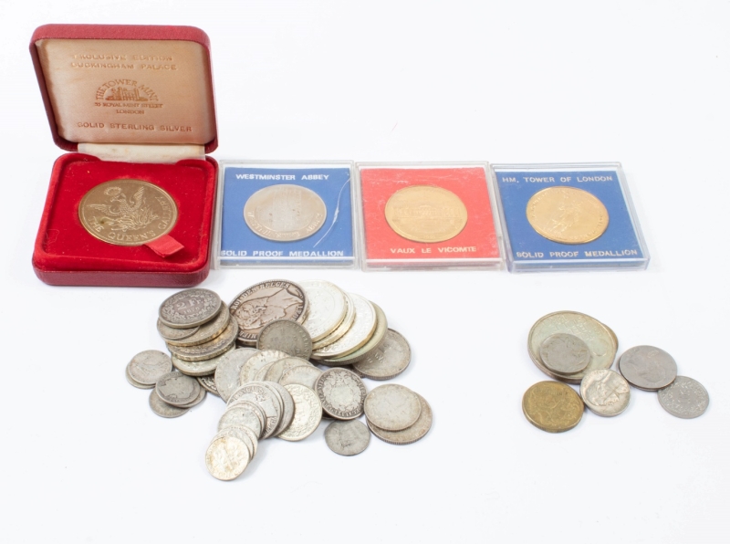 Belgique, 250 Francs, 1976 ; 5 Francs, 1865 ; 2 Francs, 1911 FL (2) ; Franc (3), 1912 FR, 1913 FR, 1914 FR ; 50 Centimes, 1910 FR ; 5 E.C.U., 1987 (3) ; Médaille des 1000 ans du monnayage de Bruxelles, 1965 ; France, 2 Francs (2), 1915, 1916 ; Franc (7), date illisible (3), 1871 A, 1872 A, 1907, 1911 ; 50 Centimes (9), 1881 A, 1898 (4), 1899, 1905, 1909, 1910 ; Suisse, 5 Francs, 1931 B, 1954 B ; 2 Francs (3), 1878 B, 1965 B (2) ; Franc (3), 1909, 1928 B, 1963 B ; U.S.A., 1939, 1947 S, 1964 ; Grande-Bretagne, Queen's gallery Buckingham palace, sterling silver, 35,76g ; avec des médailles (3) des monnaies en aluminium-bronze et cupro-nickel (7).