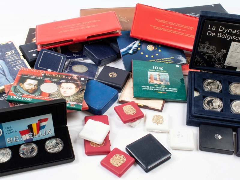 Belgique, 500 Francs, 1980 dans une boîte en plastique (3) ; Proof 500 Francs, argent 925, 22,85g (3), 2000 Charles Quint, 2000 Albert et Isabelle, 2001 ; Proof 250 Francs, argent 835, 25,00g 1976 (8) ; Proof 250 Francs, argent 925, 18,75g, (3), 1996, 1998, 1999 ; Proof 10 Euros, argent 925, 18,75g (2), 2002, 2004 ; Médaille championnat Europe de football, 2000, argent 925, 20g ; Médaille Carolus 1999, argent 925, 22,85g ; Médaille 150 ans indépendance Belgique, argent 944, 32,00g (2) ; Médaille 40 ans de mariage Albert Paola, argent 925, 22,85g ; Médaille mariage Philippe Mathilde, argent 925, 22,85g ; Médaille de la visite du Pape 1985, argent 750, 11,50g (2), Médaille 400 ans de Rubens, argent 1er titre ; Médaille argent 1er titre (4), PRO BELGICA, 1980 (2), 400 ans de Rubens, Accession au trône de Baudouin ; Coffret dynastie belge, 6 médailles proof en argent 925, 22,85g, 1998 ; Benelux, coffret des 50 ans 1994 : Belgique 250 Francs, Pays-Bas 10 Gulden, Luxembourg 250 Francs ; Franklin Mint, Peace treaty Egypt/Israel, vermeil (argent 925), 20,00g (2) ; Grèce, Médaille en argent 900, 18g, avec certificat (2).