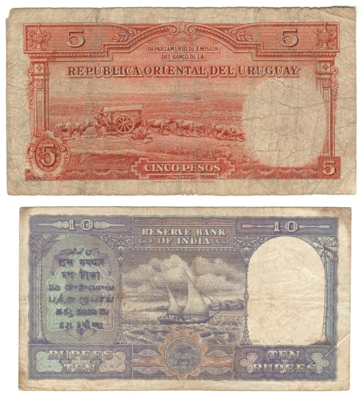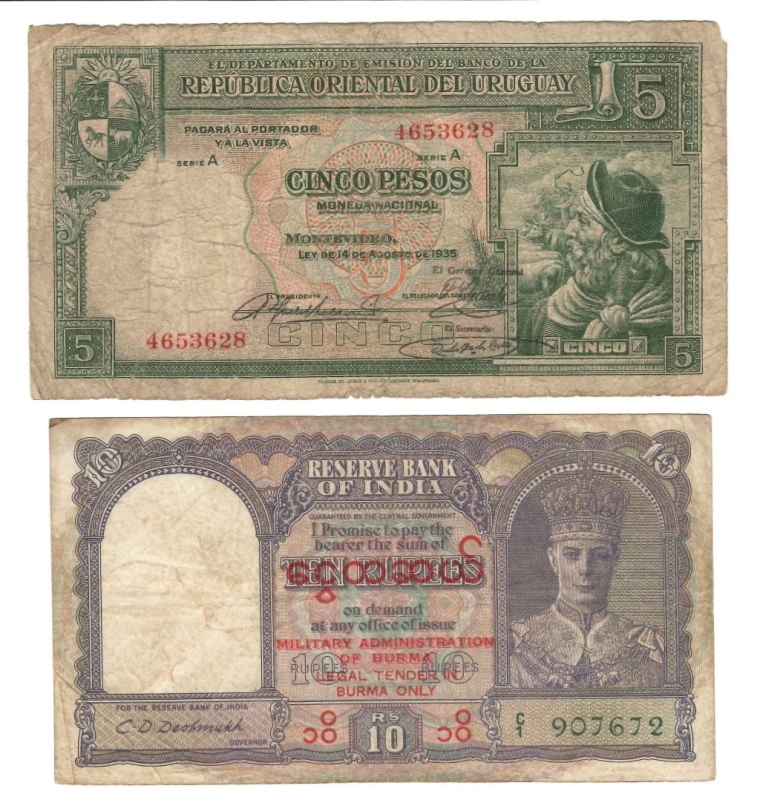 10 Rupees, (1945), C1 907672 (Pick 28). Trous d'épingle, beau ; Uruguay, 5 Pesos, 14.8.1935, serie A 4653628 (Pick 29a).