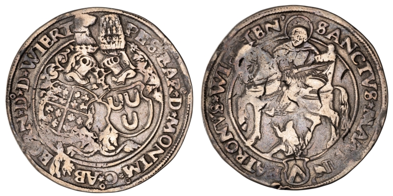 Daldre au Saint Martin (St. Martinusdaalder), 28,45g, s.d., Weert, Armes de Montmorency et Hornes heaumées, PHS★ BAR°★ D★ MONTM°★ C°★ AB HORN★ D°★ D★ WIERT, rev. Saint Martin sur son cheval à gauche, coupant son manteau pour un pauvre au sol, SANCTVS ★ MARTIN' PATRONVS ★ WIERTEN' (Delm.749).