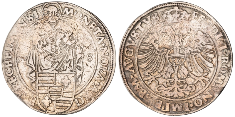 Daldre de 30 Sols (Daalder van 30 Stuiver), 28,64g, s.d., Saint Pierre tenant une clef et à ses pieds un écu écartelé, MONETA ⋆ NOVA ⋆ ARG - EN⋆ RECHEIMENSI, l'écu coupe la légende entre ARG et EN, rev. aigle impérial couronné avec un globe crucifère portant la valeur 30, FERDI ⋆ I ⋆ ROMANO ⋆ IMPE ⋆ SEM ⋆AVGVSTVS (Delm. 497 ; cf. de Mey 81B et 82A ; Vanhoudt Atlas G 1878).