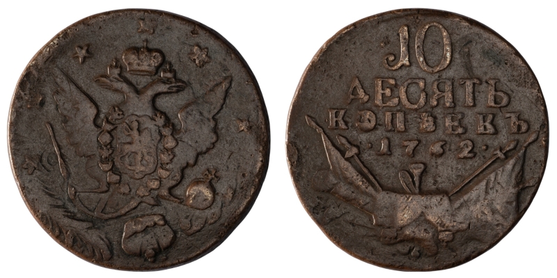 10 Kopecks, 1762, 51,78g, pas de marque d'atelier, aigle impériale couronnée, rev. trophée d'armes (KM.C.44 ; Brekke 17 ; Uzd.2622).