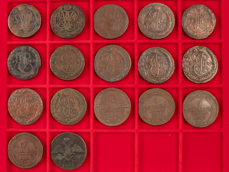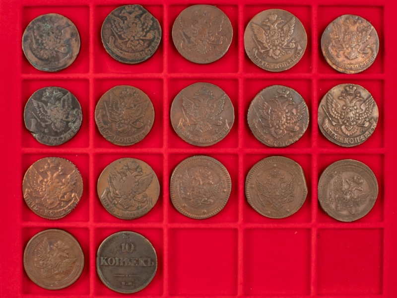 10 Kopek, 1835 EM ; 5 Kopeks (16), 1758, 1761, 1766 CM, 1764 EM, 1769 EM, 1782 EM, 1785 EM, 1790 AM, 1794 EM (2), 1795 EM, 1796 AM, 1802 EM, 1803 EM (2), 1804 EM.