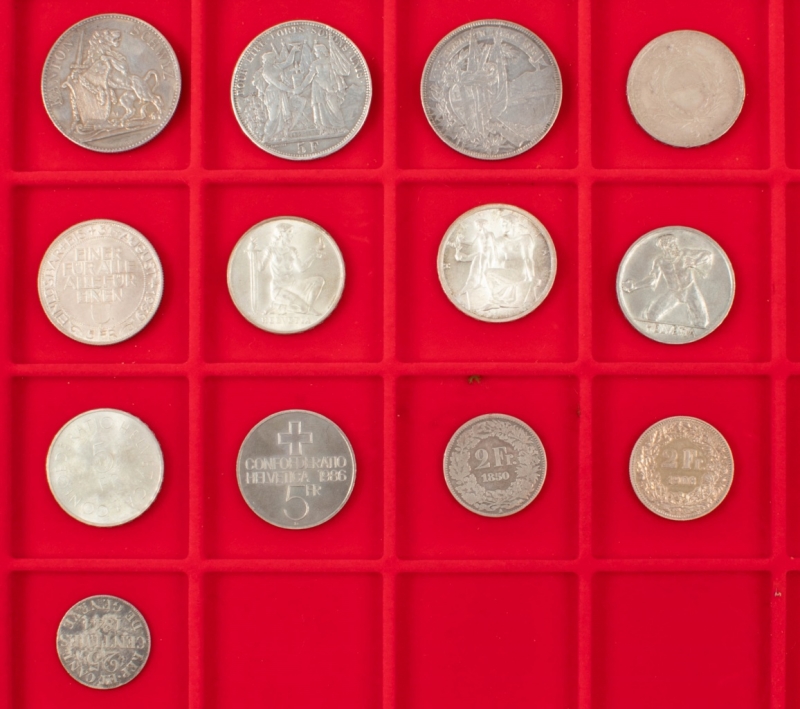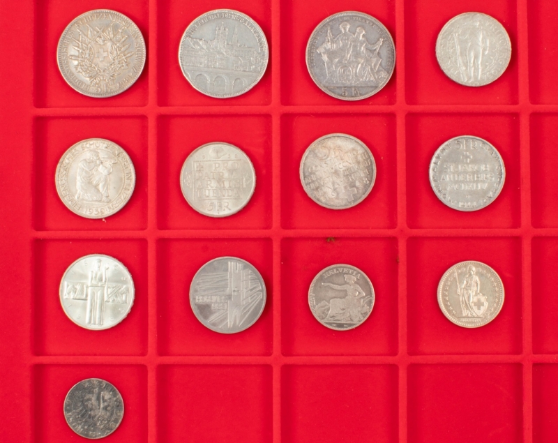 5 Francs commémoratifs (5), 1936 B, 1944 B, 1948 B, 1963 B, 1986 B ; 2 Francs (2), 1850 A, 1903 B ; Genève, 25 Centimes, 1844 ; Module de 5 Francs, Concours fédéral de tir (5): Fribourg, 5 Francs, 1934 B ; Lausanne, 5 Francs, 1876 ; Lucerne, 5 Francs, 1939 B ; Lugano, 5 Francs, 1883 ; Schwyz, 5 Francs, 1867.