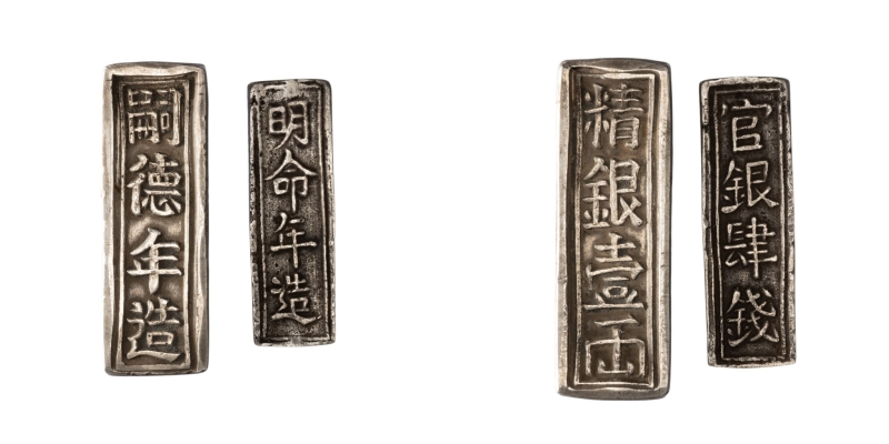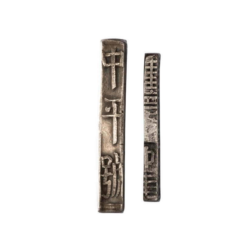 4 Tien, nd, 14,65g, 37x12mm, tranche décorée (KM.201 ; Schr.178). Très beau ; Tu Duc, Lang, 40,81g, 43x14mm, tranches inscrites avec 2 poinçons (KM.494 ; Schr.320A).