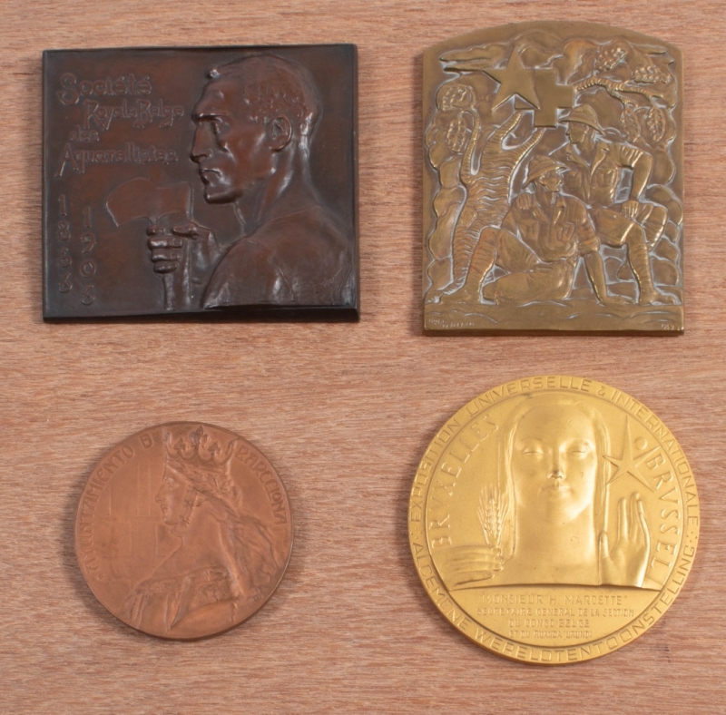 Oscar De Clerck, La croix verte coloniale de Belgique, décernée à Henry Marcette, secrétaire général du cercle africain 1959, en bronze, 88 x 72 mm ; Meunier pour Wolfers, Société royale belge des aquarellistes 1856 1906, bronze, 85 x 75 mm ; Rau, Exposition universelle & internationale, Bruxelles, 1958, décernée à H. Marcette Secrétaire général de la section du Congo belge et Ruanda Urundi, bronze doré, 79 mm ; Espagne, Arnau et Rodriguez, Exposicion internacional d'arte Barcelona 1907, décernée à Alex. Marcette, bronze, 59 mm.