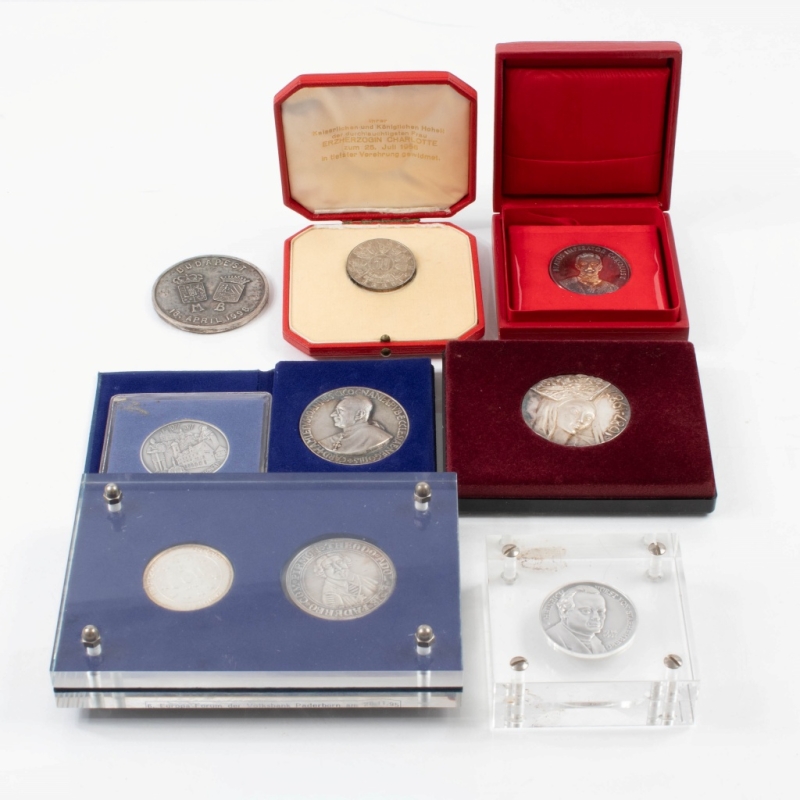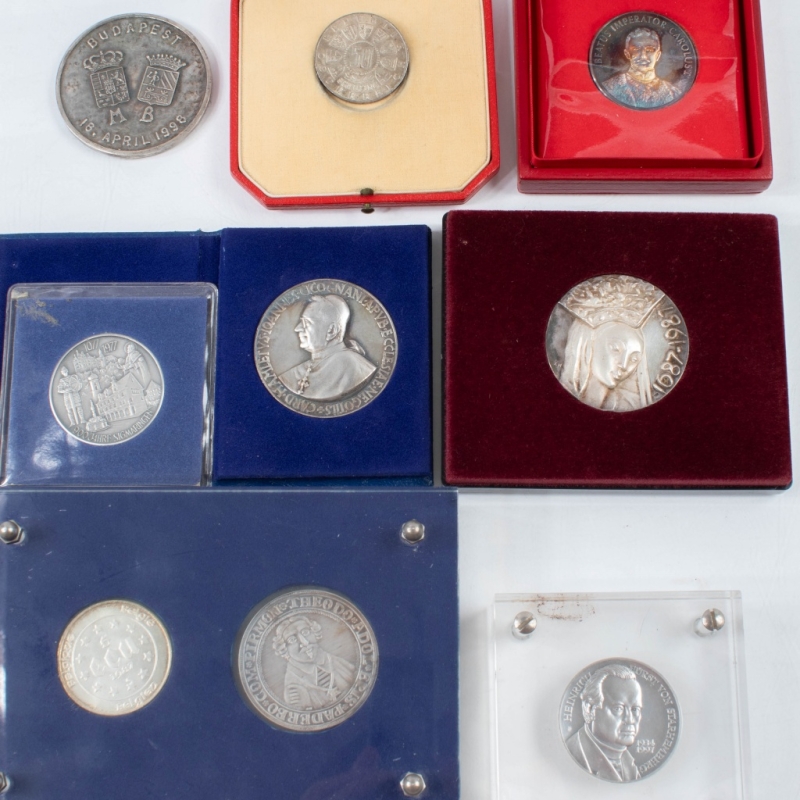 Allemagne, Médaille en argent (poinçon 1000 sur la tranche), 900 ans de Sigmaringen, 1077-1977, 24,65g, 40mm ; Refrappe d'un thaler en argent (poinçon 999) de Théodore Adolphe, évêque de Paderborn, 1990, 45mm, 28,92g ; Autriche, Médaille en argent (poinçon 925), Heinrich Furst von Starhemberg ; 50 Schilling en argent (900/1000), 600 ans du Tirol, 1363-1963, 33mm, 20g ; Belgique, 5 E.C.U., 1987 ; Croatie, médaille en argent (poinçon 999), 300 ans de la vierge de Sinj 1687-1987, 59mm, 56,30g ; Hongrie, Médaille uniface en bronze argenté, BUDAPEST 18 APRIL 1998, 58mm, 76,24g ; Malte, Médaille en argent (poinçon 999), Sacra Domvs Hospitalis S. Johannis Hierosolymitani, Beatus Imperator Carolus I, 31,81g, 39mm; Vatican, Médaille en argent (poinçon 986), par Sabbatani, Cardinal Hamletus Ioannes Cicognani, 58,70g, 50mm.