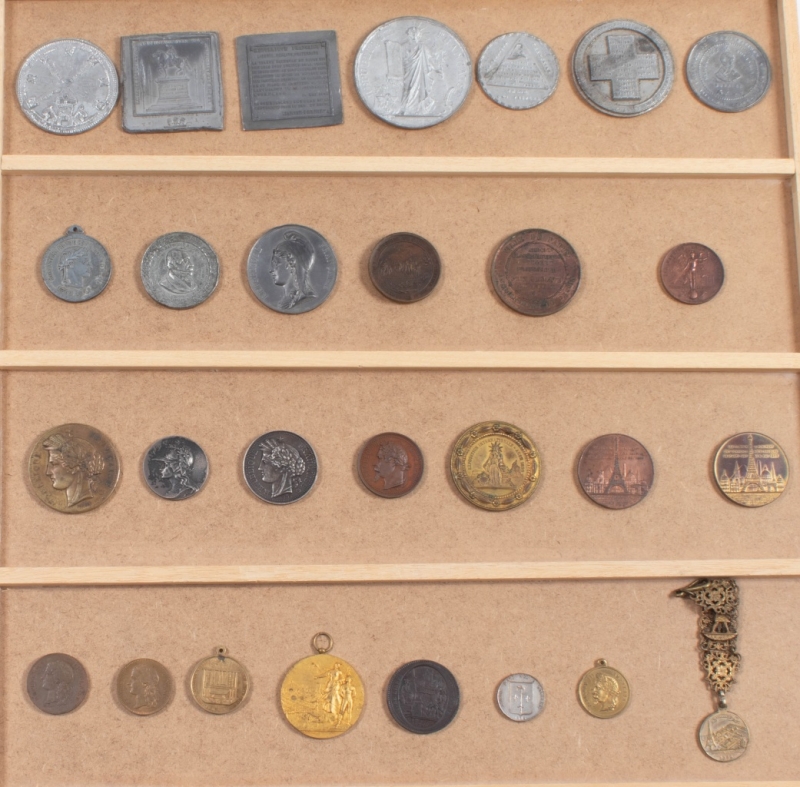 Mémorial de Sainte-Hélène, par Bovy, 1840 ; Hommage du peuple français à la nation anglaise, par Gayrard, 1830 ; Deuxième république: Statue équestre de Louis XIV à Lyon par Lemot, Garapon, plaque uniface, 58 x 59mm, étain avec le revers ; Race de Caïn - Race d'Abel, 60mm, étain ; Citoyen Sobrier, 50mm, étain ; Gouvernement insurrectionnel à l'Hôtel de Ville, 1848, 47mm, étain ; Dénonciation de la Constitution de 1848, célébration de la République intemporelle, LES SEPT PLAIES DE LA REPUBLIQUE DE 1848, 59mm, étain ; avec Club des Philantropes républicains à la Rotonde - Aux Brotteaux, 68mm, étain ; Caqué, Convention-Directoire-Consulat, 1834, étain ; Election du président Louis Napoléon Bonaparte, 44mm, étain ; Palais de l'industrie par Oudiné, cuivre, 36mm ; Lagrange, Enseignement du dessin, Ville de Paris, 1879, 51mm ; Vernon, Exposition internationale Agen, 1899, 50mm ; Paris, Union des sociétés de gymnastiques 1878 ; Fédération gymnastique et sportive des patronages de France par Desvergnes, Aulnay S/s bois, 1910, etc.