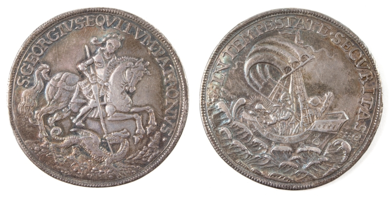 Médaille en argent, "St. Georgstaler", 26,84g, 44mm, probablement 19e siècle, Christ dans un bateau naviguant à droite, IN TEMPESTATE SECVRITAS., rev. Saint Georges terrassant le dragon ; S GEORGIVS EQVITVM PATRONVS.