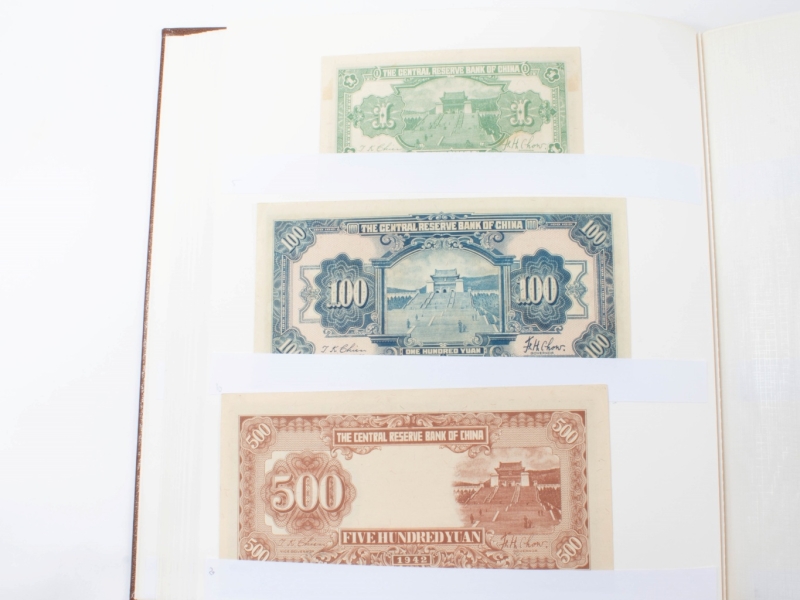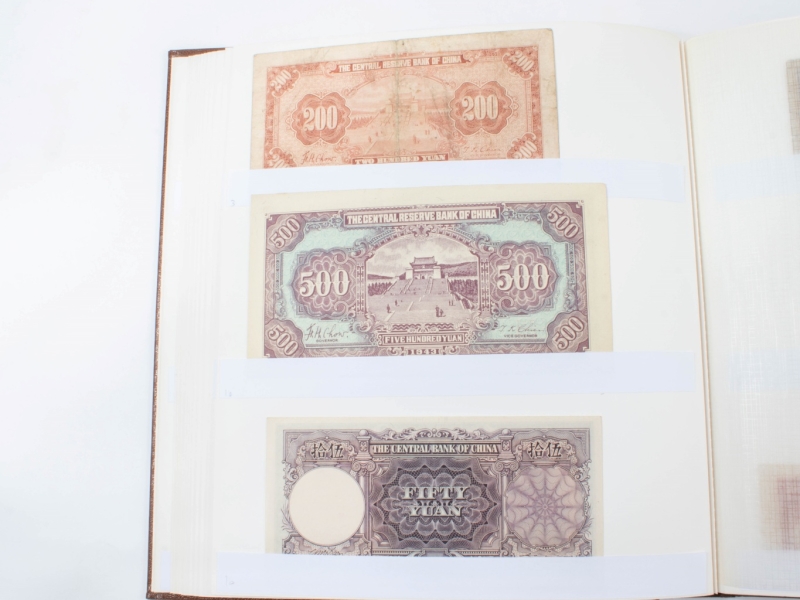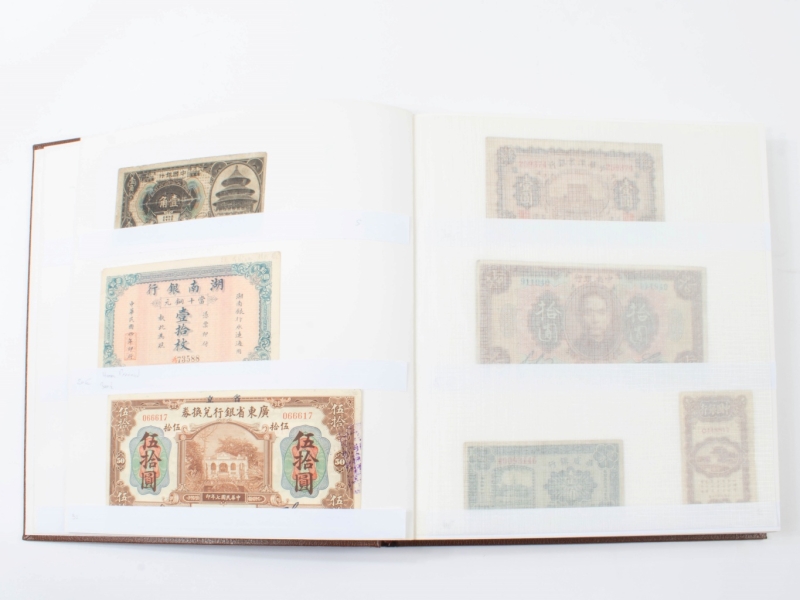 Un album comprenant Bank of China, 100 Yuan, 1940 Chungking ; 25 Yuan, 1940 ; 5 Yuan (2), 1926, March 1935 ; Yuan, Shanghai, 1935 ; The Central bank of China, 10 Dollars (3), 1923, 1928 (2, sign. 5, sign.7) ; Dollar, Shanghai, 1928 ; 10 Cents, (1940) ; 5000 Yuan, (1945) ; 2000 Yuan, (1945) ; 500 Yuan, 1944 ; 50 Yuan (2), 1936, 1944 ; 10 Yuan, 1936 ; 5 Yuan, 1936 (2) ; Yuan, 1936 (2) ; 5000 Customs gold units ; 500 Customs gold units, 1947 ; The Central reserve bank of China, 500 Yuan (2), 1942, 1943 ; 100 Yuan, 1942 ; 10 Yuan, 1940 ; 5 Yuan, 1940 ; 10 Cents, (1943) ; The Exchange bank of China, Dollar, Tientsin, 1.1.1920 ; 10 Cents, 1.5.1928 ; The Farmers bank of China, 100 Yuan (2), 1941, 1942 ; 50 Yuan, 1941 ; Yuan, (1941) ; 10 Cents, 1937 ; The Charhar commercial bank, 20 Cents, (1935) ; Provincial bank of Chihli, Yuan, Tienstsin, 1.10.1926 ; Hunan provincial bank, 10 Coppers, 1915 ; Hupeh provincial bank, 100 Copper ; Provincial bank of Kwangsi, 5 dollars, 1929 ; Provincial bank of Kwangtung province, 50 Dollars, 1.1.1918 ; Dollar, 1.1.1918 ; Kwangtung provincial bank, 10 Dollars, 1931 ; 10 Dollars, 1931 overprint Local Currency ; 5 Dollars, 1931 ; Dollar, 1931 overprint Local Currency ; Bank of Liuan, Yuan, n.d. ; Sino-Scandinavian bank 10 Cents, Tienstsin, 1.10.1925 ; Bank of Taiwan, 10 Yuan, (1976) ; 5 Yuan, 1955 ; Soviet occupation, 100 Yuan, (1946), etc.