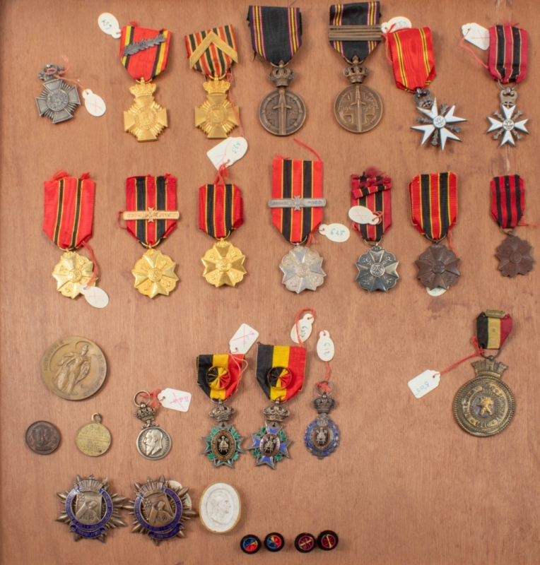Décoration militaire (3), monogramme LLII (pas de ruban), monogramme AI (2), une pour ancienneté avec un chevron sur le ruban, l'autre pour courage avec palme d'argent sur le ruban ; Médaille du prisonnier de guerre 40-45 (2, une avec 5 barrettes au ruban) ; Décorations civiques pour actes de courage : croix d'argent (2), 35mm, 42mm ; Médaille d'or, 34mm (3 dont une avec une barrette sur le ruban Courage Moed) ; Médaille d'argent, 34mm (2 dont une avec une barrette sur le ruban Courage Moed) ; Médaille de bronze, 34mm ; Médaille de bronze pour ancienneté administrative, 30mm ; Société royale et centrale des Sauveteurs, insigne décerné à E. de Kerchove d'Exaerde, 26mm ; Badges de la ligue de protection aérienne par Degreef (2) ; Insigne de délégué communal 1830-1880, 47mm ; Médaille du mariage de la princesse Charlotte avec l'archiduc Ferdinand d'Autriche, 27mm ; Hart, médaille en bronze pour l'entrée à Bruxelles 1832, 27mm ; Fisch, médaille en bronze Campagne de Belgique 1914-1915, 50mm ; Würden, Médaille de la visite de le Princesse Elisabeth et Prince Albert à l'hotel de ville de Bruxelles, 1900 ; On y joint un médaillon oval uniface en plâtre représentant Leopold Ier, etc.