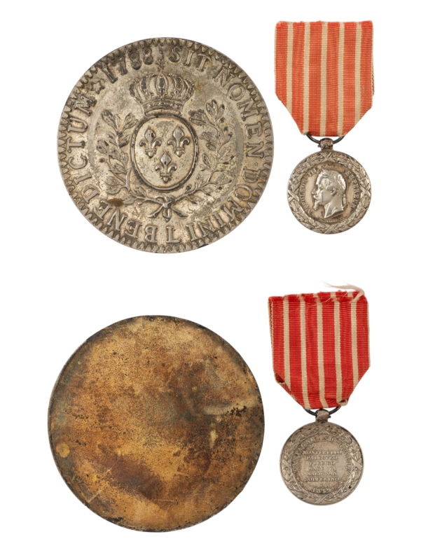 Médaille en argent, 30mm, signature BARRE, avec un médaillon en métal argenté, 77mm, représentant le revers d'un écu aux lauriers de 1788.