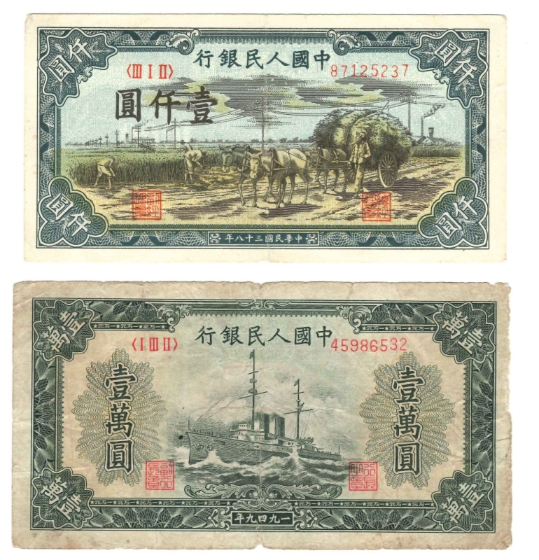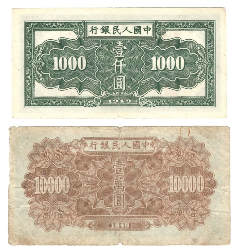 10000 Yuan, 1949, I III II 45986532 (Pick 854). Petites déchirures, assez beau ; 1000 Yuan, 1949, III I II 87125237 (Pick 849).