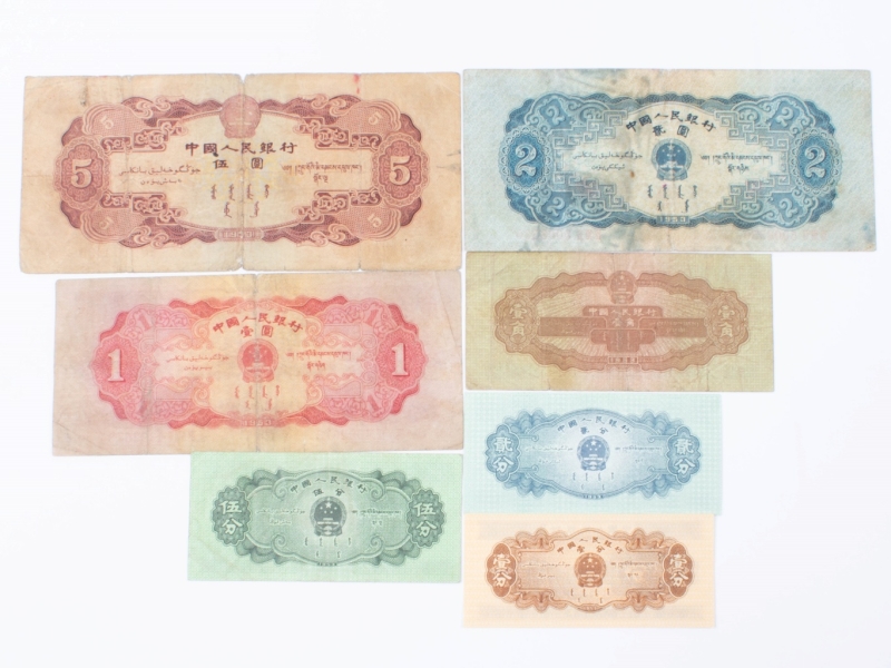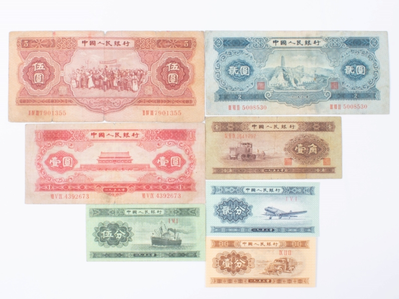 Emission de 1953: 5 Yuan, 2 Yuan, 1 Yuan, 1 Jiao, 5 Fen chiffres romains seulement, 2 Fen chiffres romains seulement, Fen chiffres romains seulement (Pick 860, 861, 862, 863, 866, 867, 869).