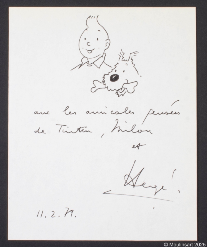 Illustration sur papier libre (161 x 128mm) représentant les têtes de Tintin et Milou avec une dédicace signée et datée du 11 février 1979.
