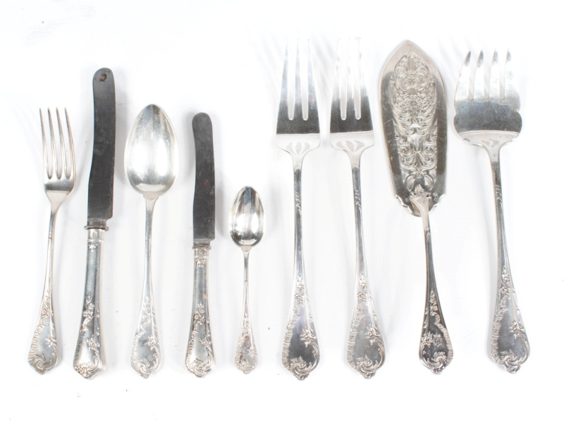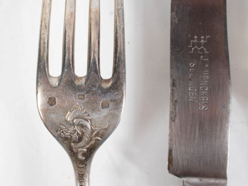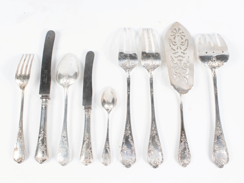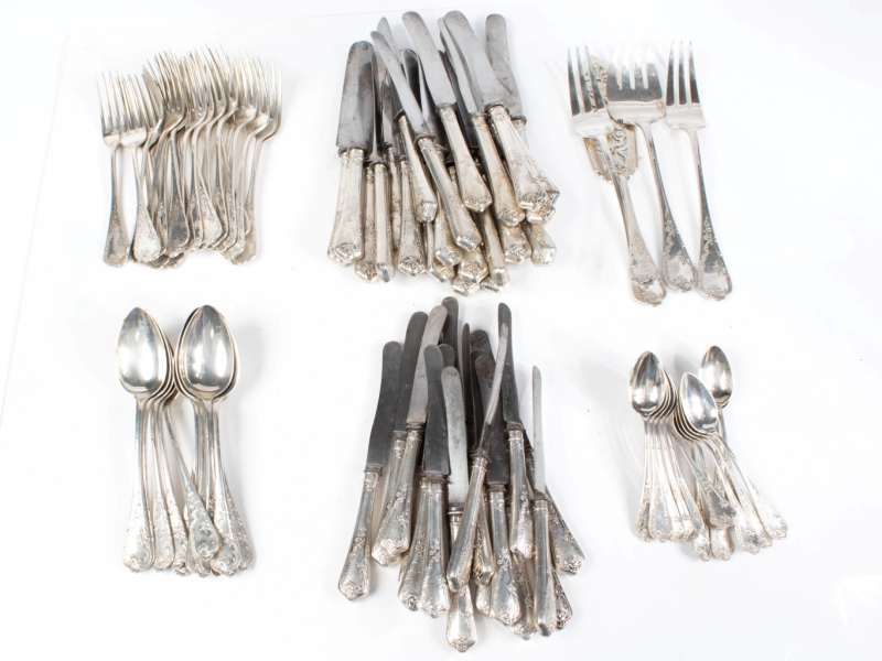 12 grandes cuillères (980 gr), 24 grandes fourchettes (1834 gr.), 24 grands couteaux (2378,9 gr bruts), 17 couteaux à entremets + un manche (1138 gr. bruts), 16 cuillères à thé (490 gr), 4 couverts de service (532 gr). Lames signées Henckels Solingen.