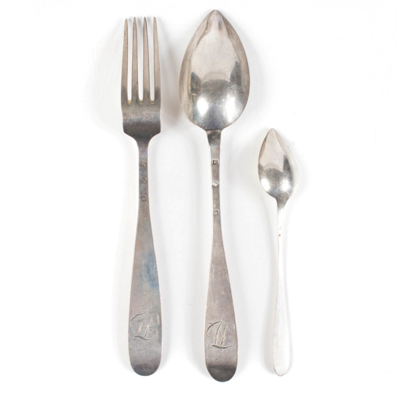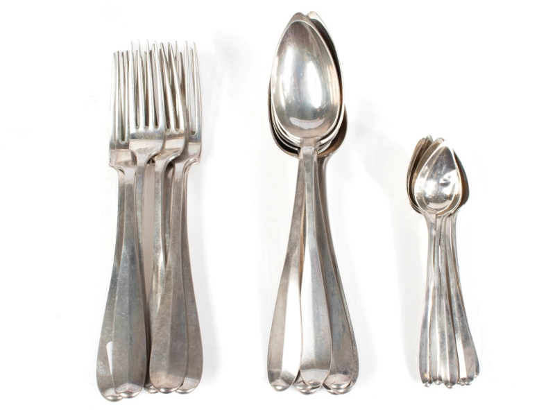 en argent comprenant 7 grandes cuillères, 7 grandes fourchettes, 12 petites cuillères