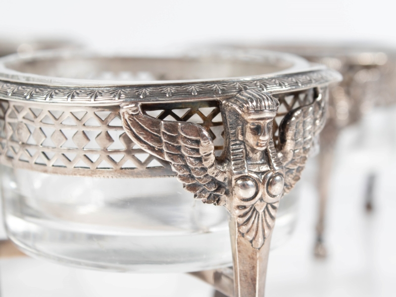 en argent et coupelles en verre. Poinçons M.O JS, garantie 1809-1814 pour trois et 1815-1832 pour les trois autres
