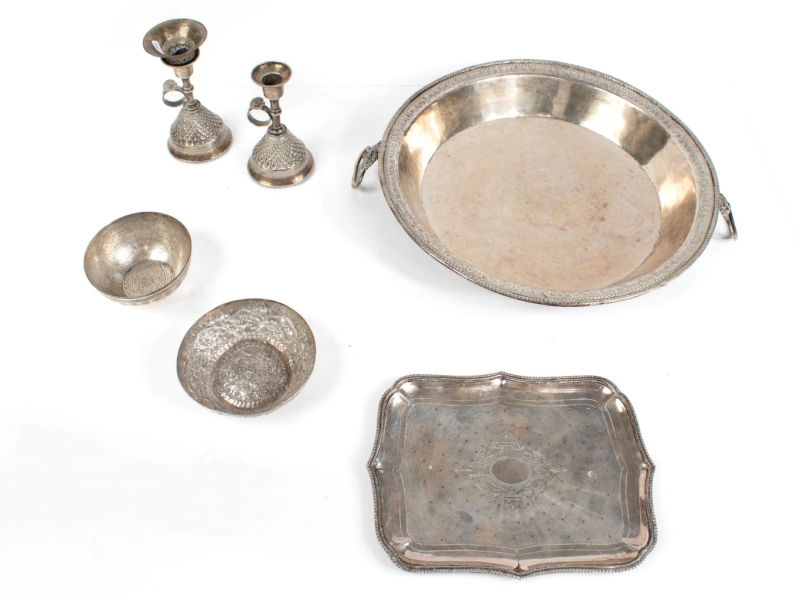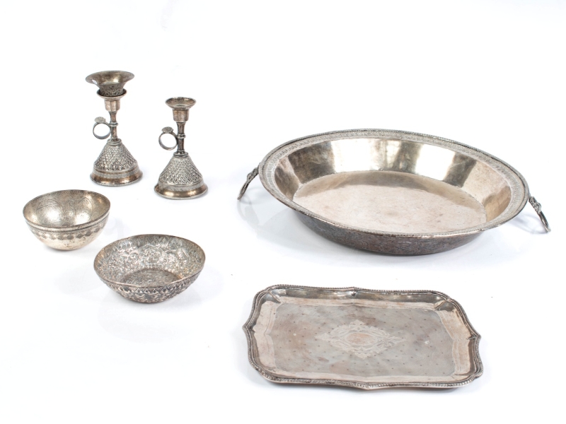 en argent comprenant un bassin, un plateau, deux bougeoirs, deux coupelles. Tughra sur le plaetau et les deux bougeoirs, poinçons égyptiens sur une coupelle, les deux autres sans poinçons.