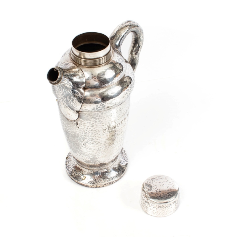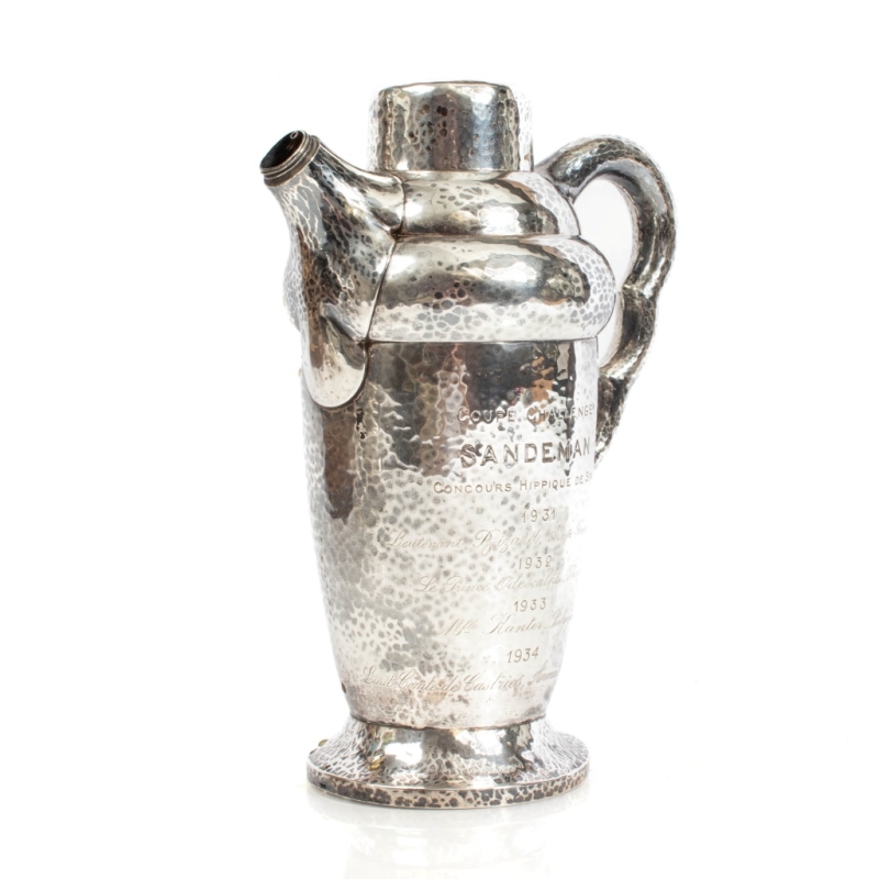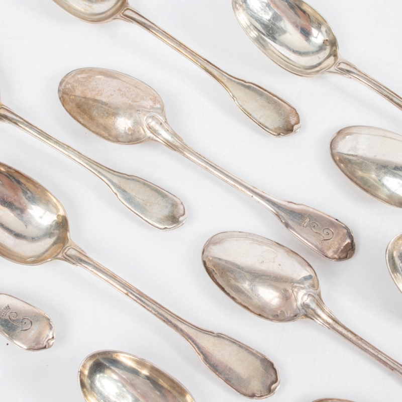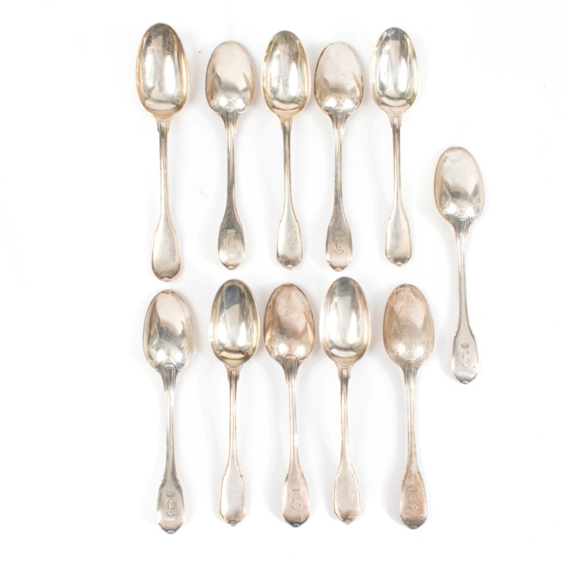 en argent comprenant 11 petites cuillères chiffrées L sous couronne, poinçons tête de Mercure et M.O "HL" avec un animal dans un losange (138 gr) et une cafetière dédicacée avec bouchon à vis, poinçons 800 et M.O Raymond RUYS (Act; Anvers 1919-1947) (988 gr)