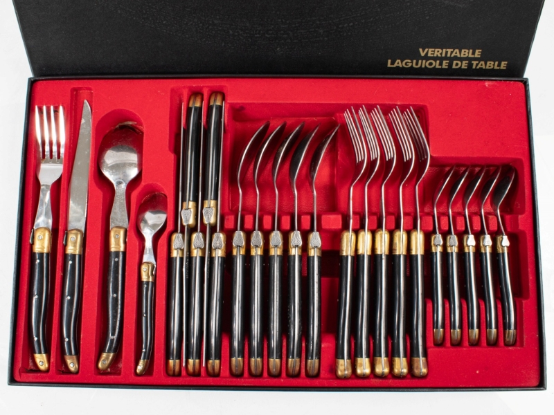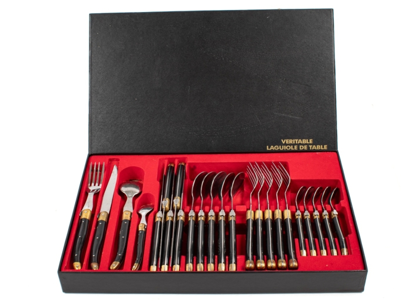comprenant six couteaux, six fourchettes, six grandes cuillères et six petites cuillères. Dans leur boite