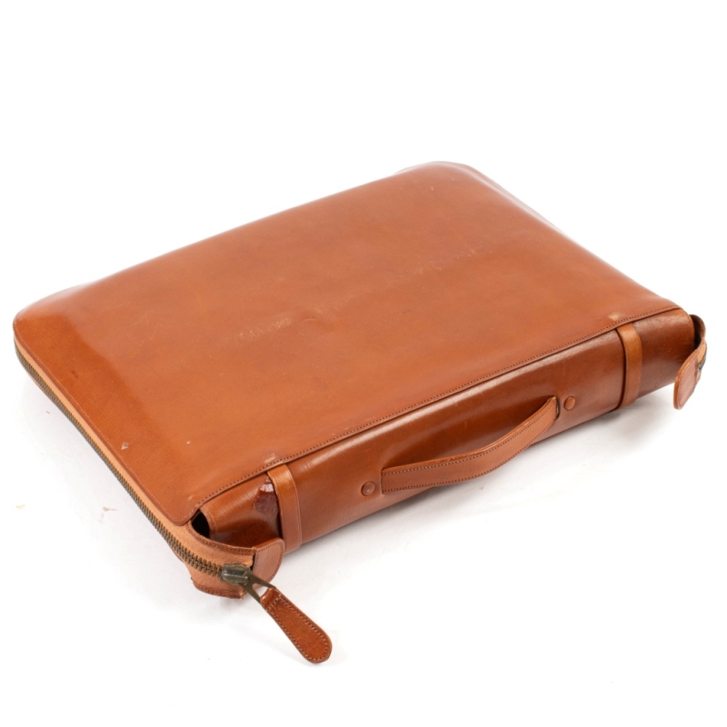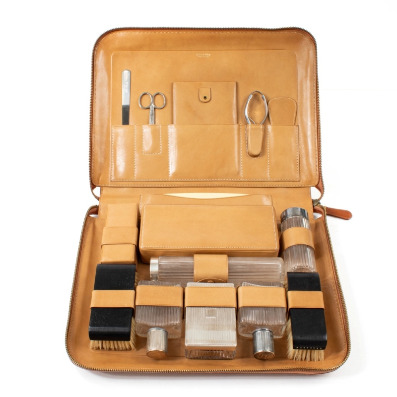 en cuir cognac, intérieur en cuir camel comprenant deux boites et un miroir en cuir, cinq flacons en cristal et bouchons en argent (poinçons 925 et Italie), deux brosses, un peigne, une lime à ongles, une pince à ongles, une paire de ciseaux, un chausse-pied. Marqué "Prince of Wales, Brussels"