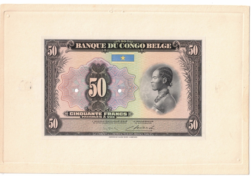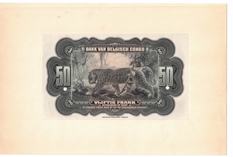 Paire d'épreuves unifaces de l'avers et du revers du billet de 50 Francs, par American Bank Note Company, 150mm x 95mm, Modèle 1949-1951, signatures: Feyerick-Charles, pas de mention de l'émission, de la série et du numéro de série (cf. Pick 16g, 16h, 16i ; cf. Martiny BCB27#5, BCB27#6, BCB27#7 ; cf. LA#BCB-24).