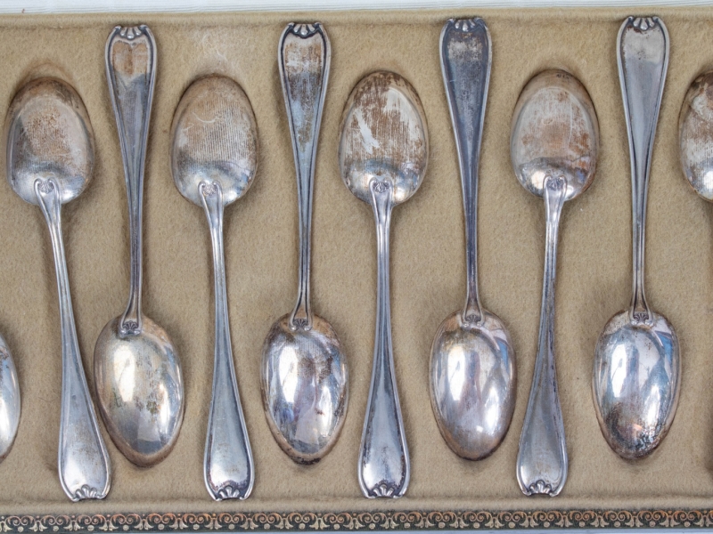 les cuillères à café en argent, modèle filet et agrafe, poinçons M.O (Van Regemorter) et A800, dans un écrin de la maison Hardy & Wolfers à Liège.