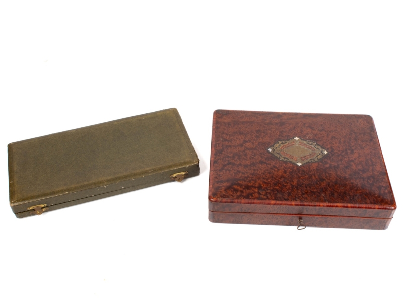 Le service à thé dans un écrin en placage de ronce et incrustation de laiton doré et de nacre comprenant un passe thé, une pince à sucre, une cuillère à servir et douze cuillères en vermeil, M.O C&G dans un losange, poinçon tête de Mercure.