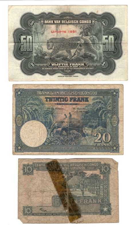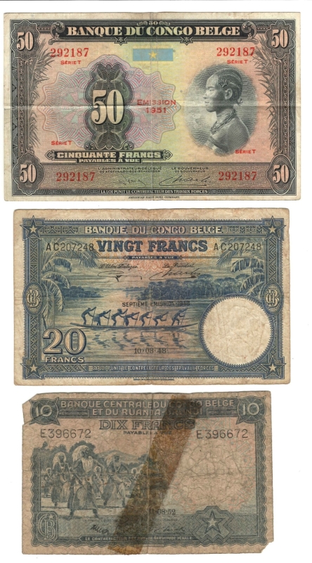 50 Francs, 1951, Série T, 292187 (LA#BCB-24 ; Martiny BCB27#7; Pick 16i). Pliures, petits trous, beau ; 20 Francs, 10.8.1948, AC 207248 (LA#BCB-20 ; Martiny BCB24#1; Pick 15F). Petit trou, assez beau ; Banque centrale du Congo belge et du Ruanda-Urundi, 10 Francs, 31.8.1952, E 396672 (LA#BRB-2 : Martiny BCCBRU2#3 ; Pick 22).