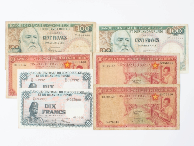 100 Francs (2), 01.12.1956, V 646566, 01.3.1957, AC111777 ; 50 Francs (4), 01.4.1957, B 939460, 1.6.1957, J017178, 01.7.1957, N956642, 01.2.1959, S426910 ; 10 Francs, 1.10.1958 (2), B/N 093980, B/N 093992 (LA#BRB-3, 9, 11 ; Martiny BCCBRU10#19, BCCBRU12#2, #4, #5, #7, BCCBRU13#12, #16 ; Pick 30b, 32, 33b).
