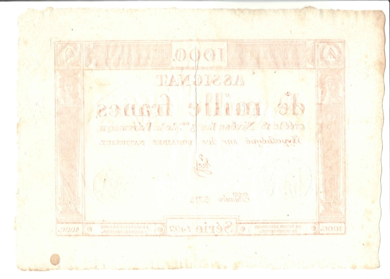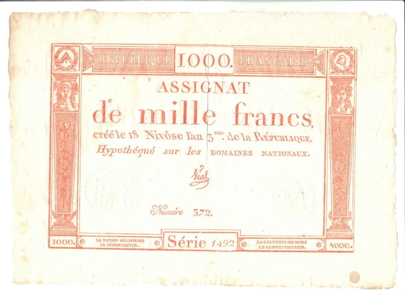 Assignat de 1000 Francs, 18 Nivôse l'an 3, Série 1492 numéro 372, signature: Vial (Ass-50a ; Laf.175 ; Pick A80).